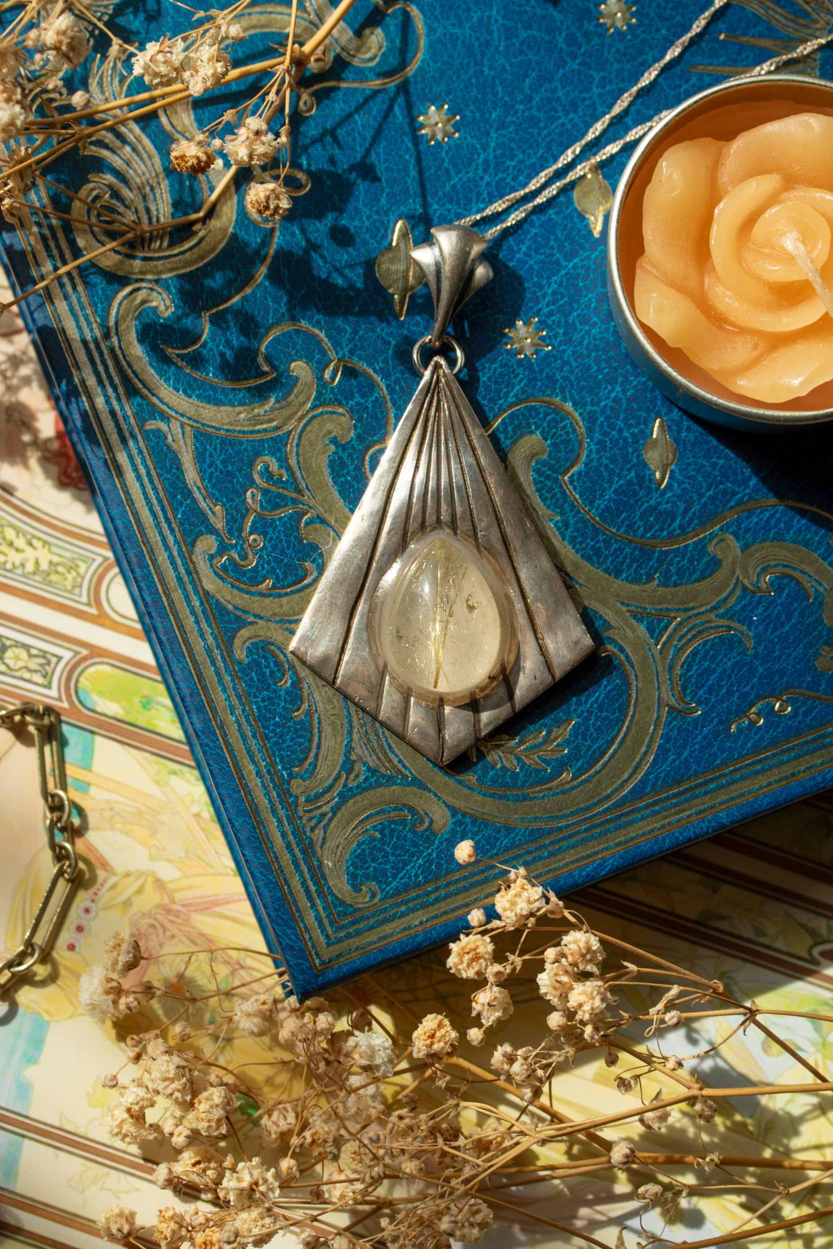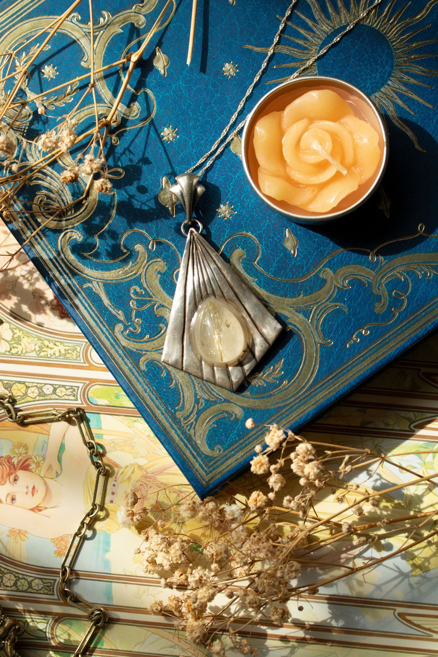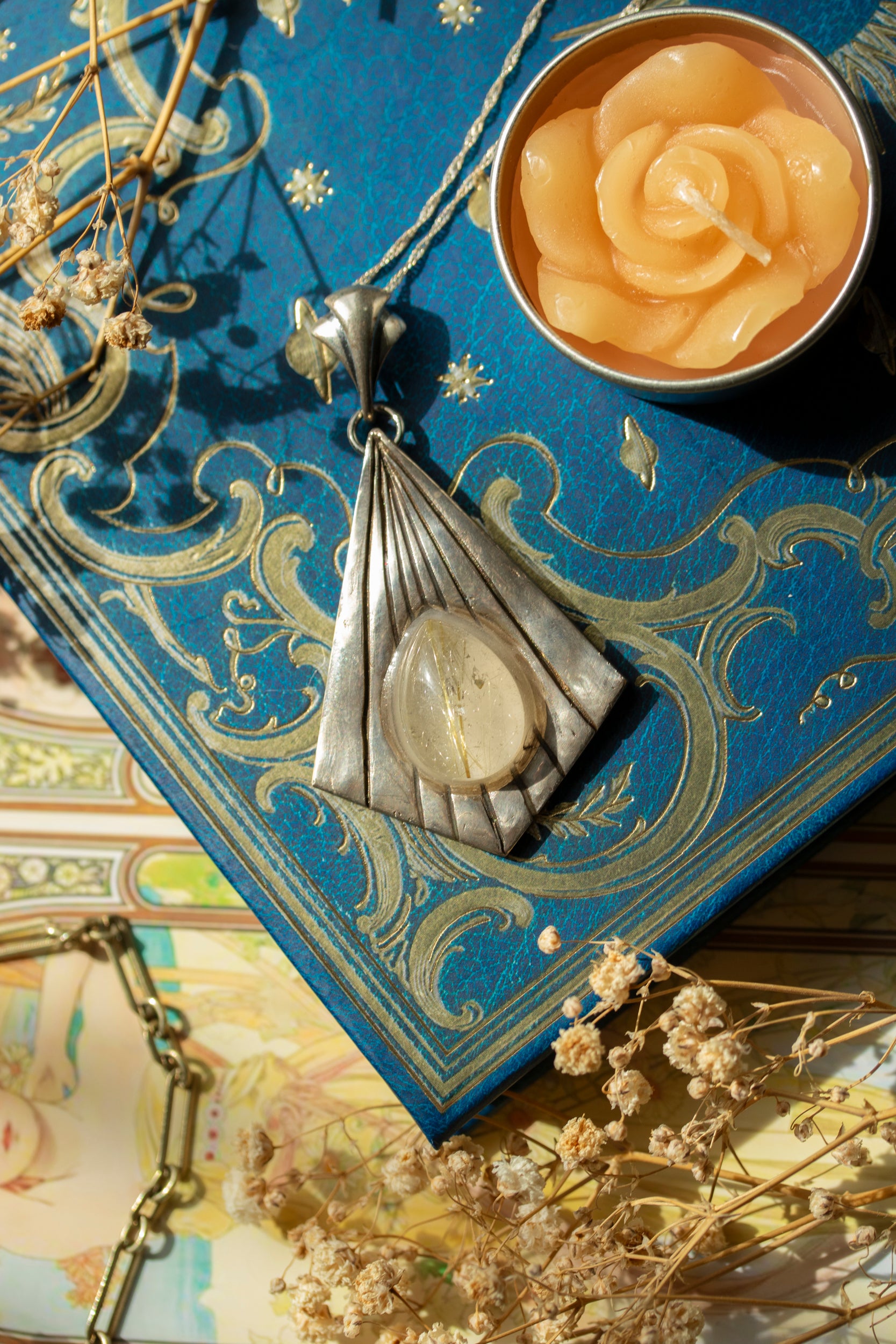Hand molded and made, this unique piece was crafted from .999 fine silver clay and the stone was set with a bit of uv glowing resin behind it to shine through the quartz.