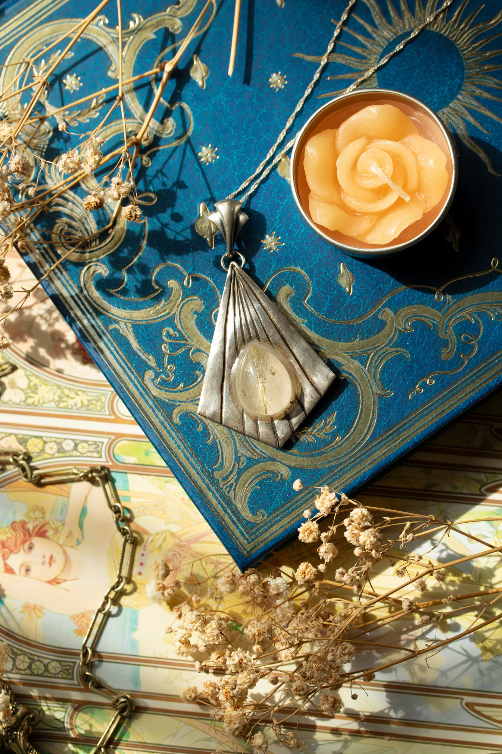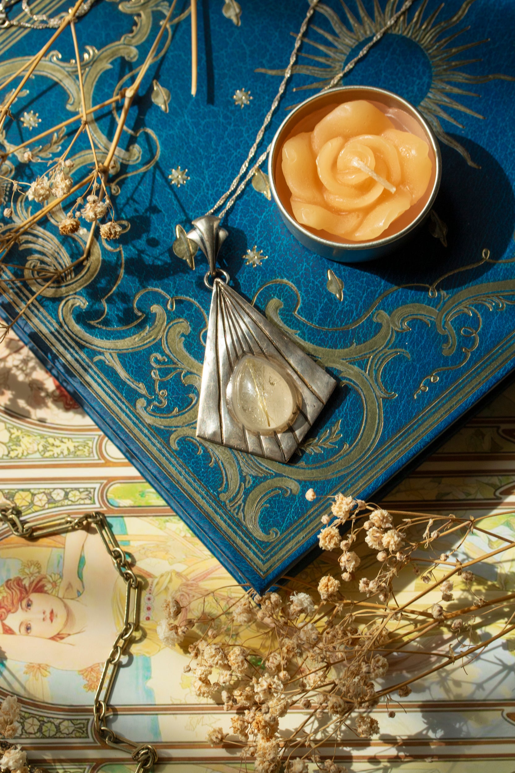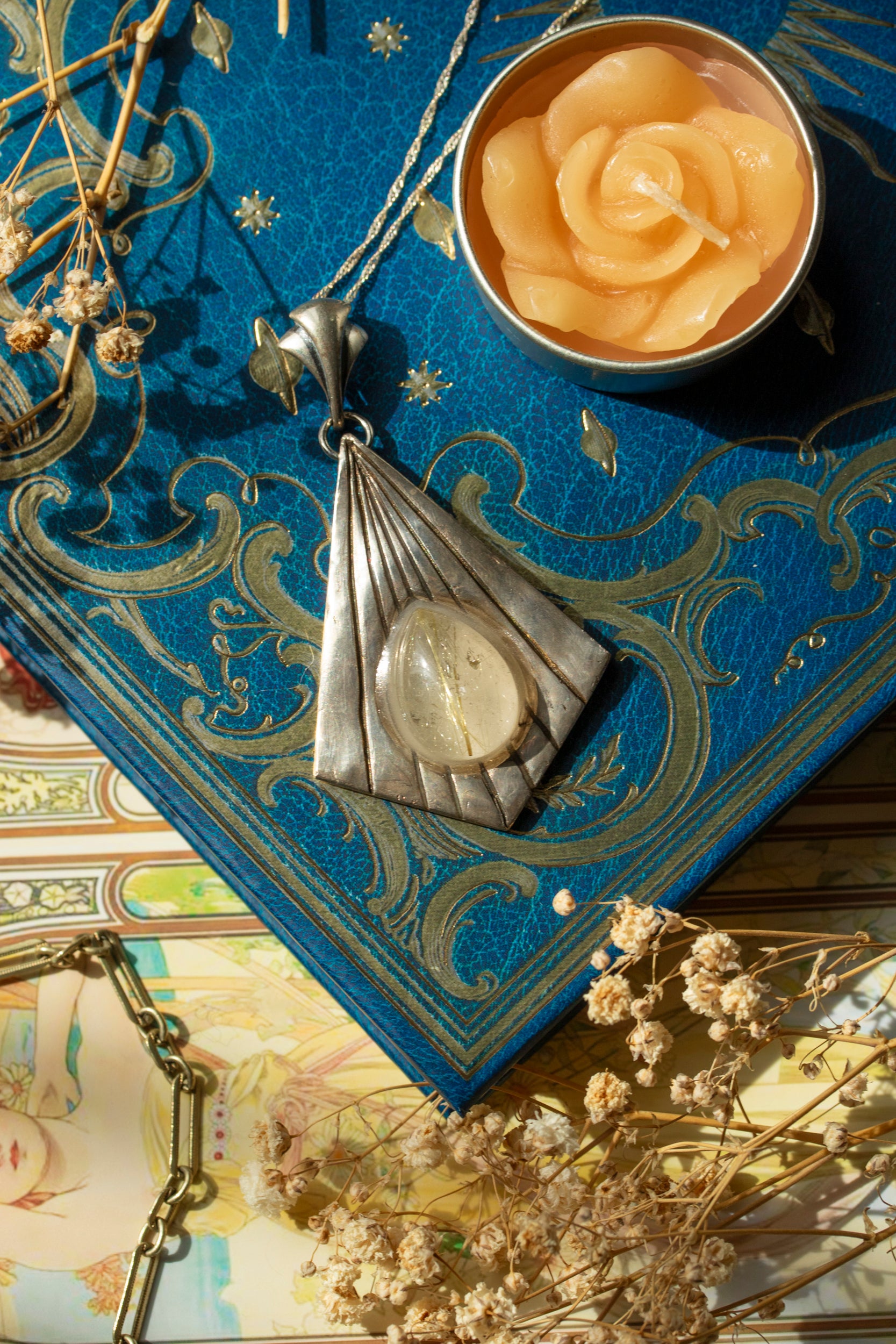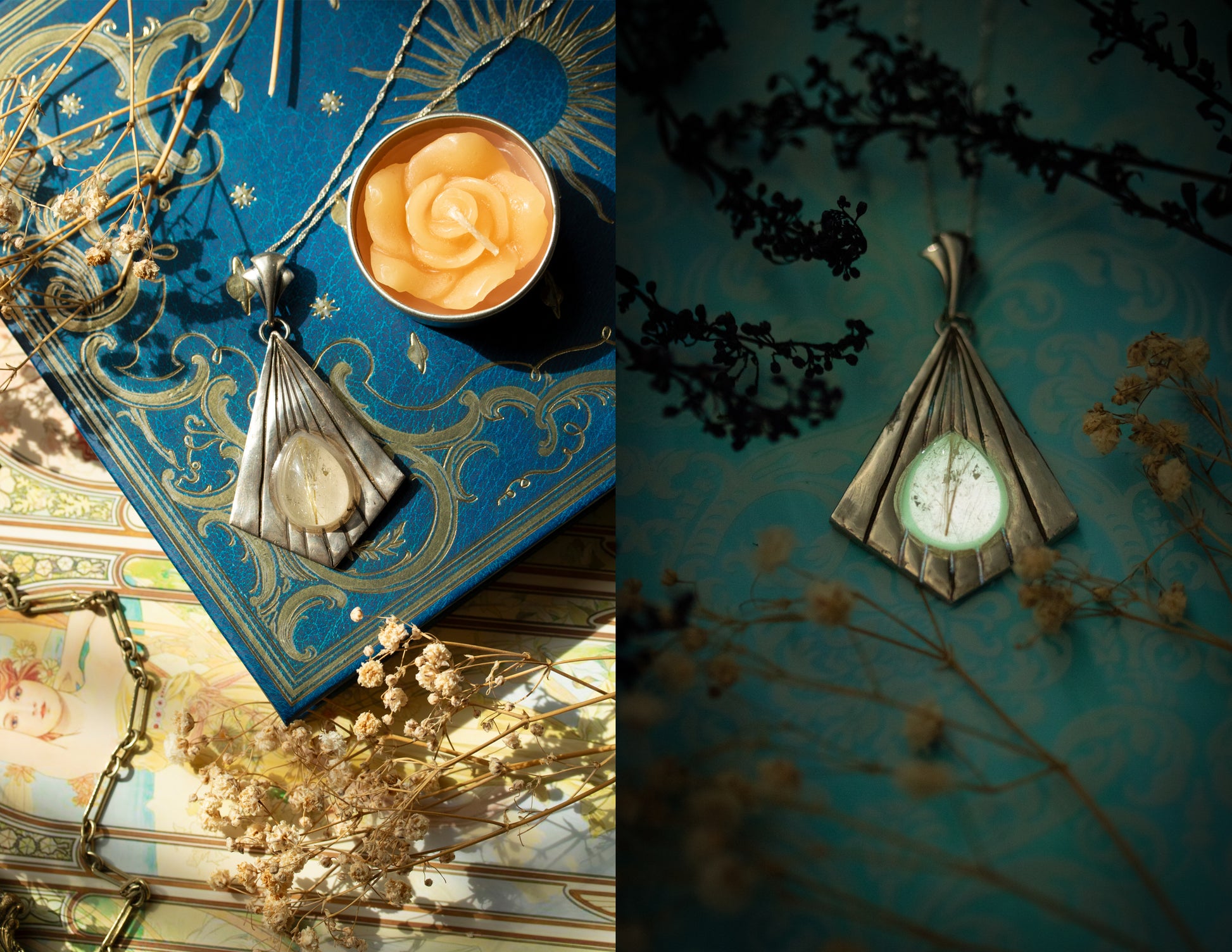 Hand molded and made, this unique piece was crafted from .999 fine silver clay and the stone was set with a bit of uv glowing resin behind it to shine through the quartz.