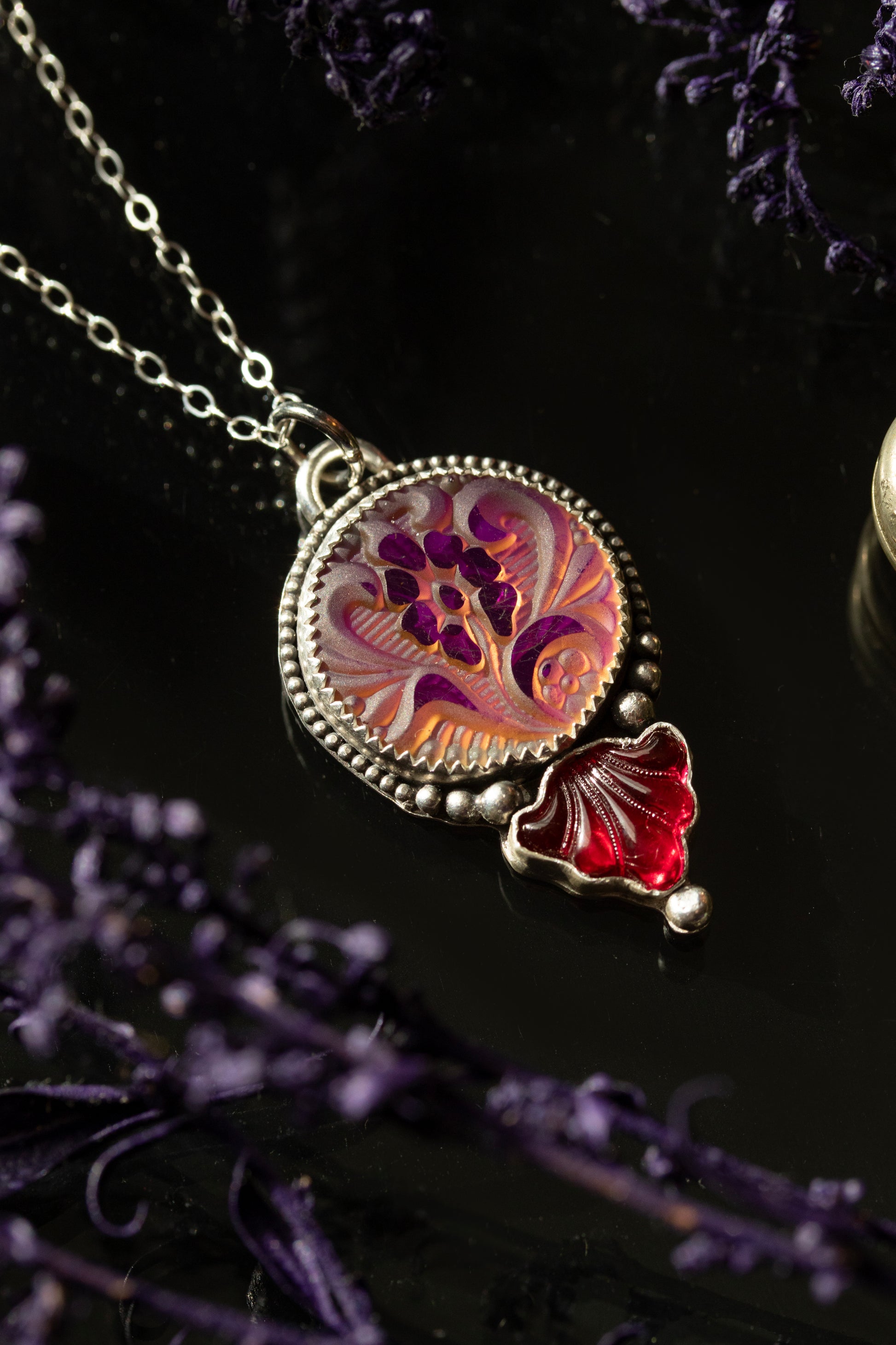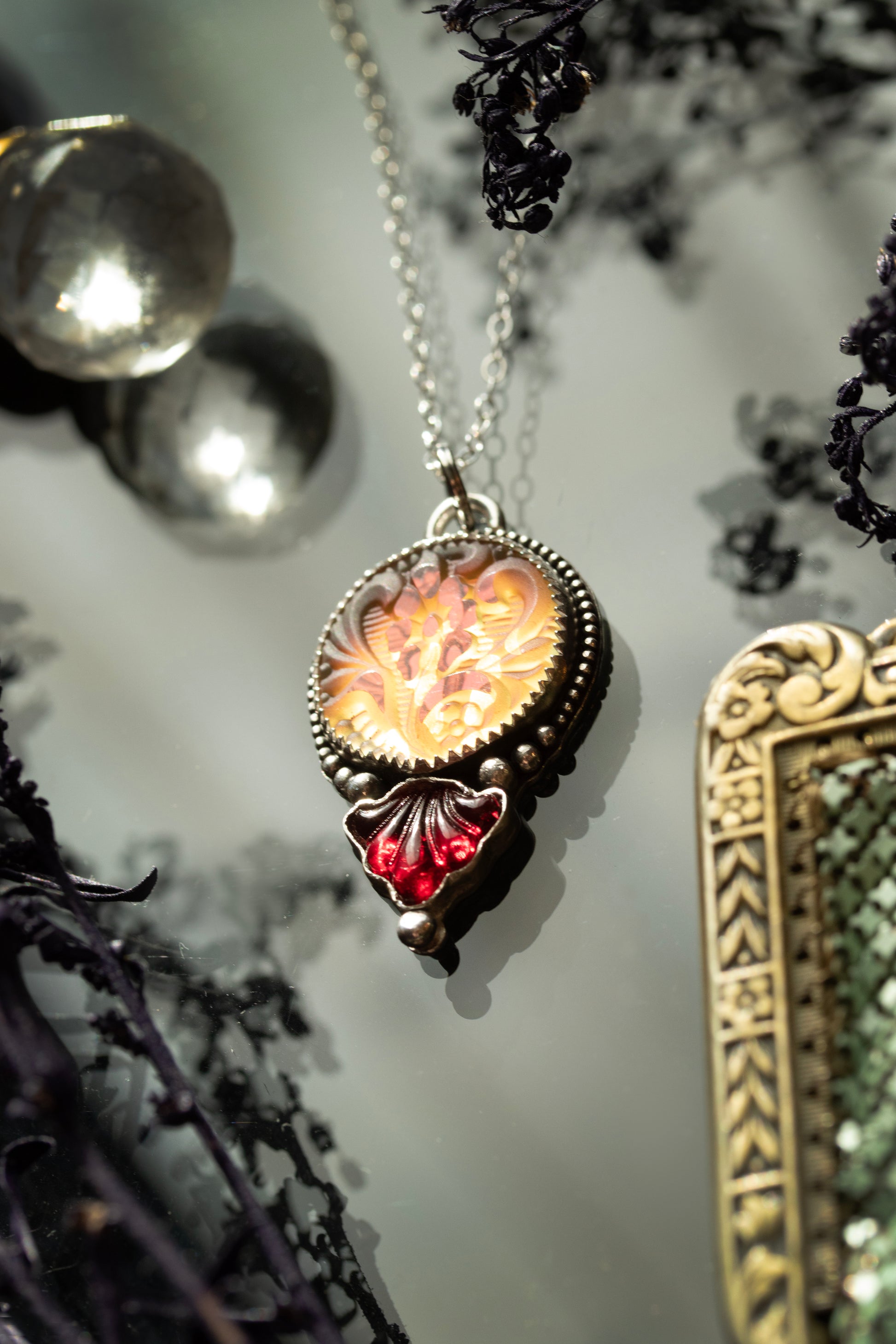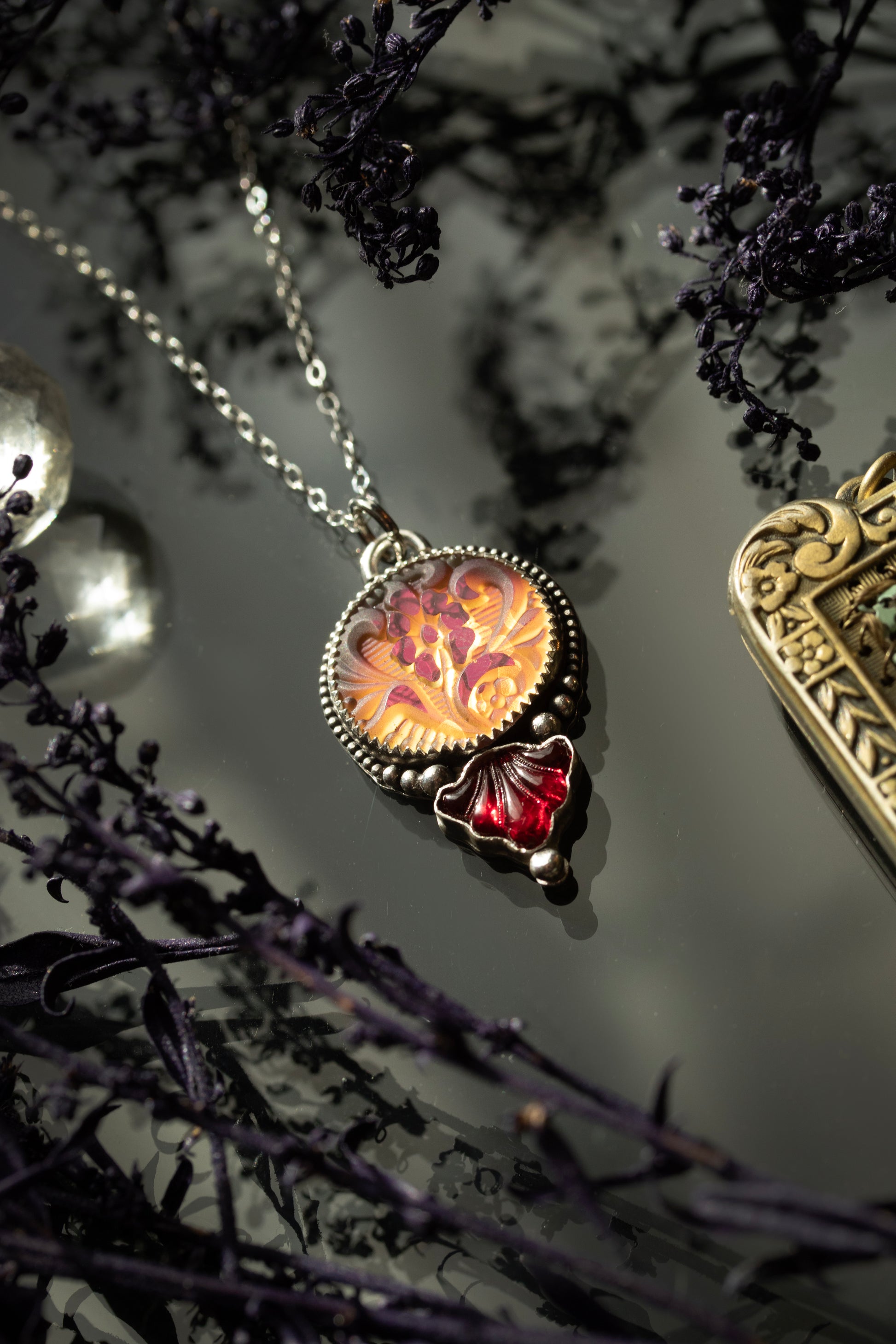 Handmade Art Nouveau inspired necklace with a metallic pink/orange flower cabochon & red glass Art Deco fan set in sterling & fine silver