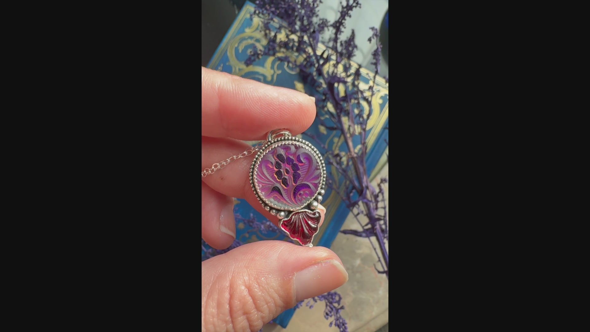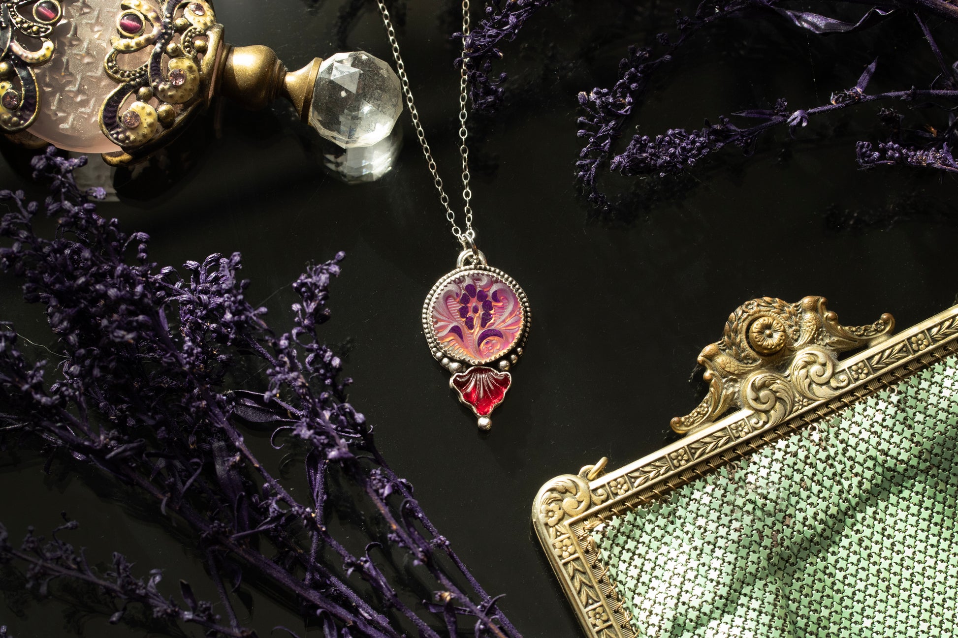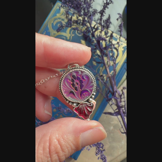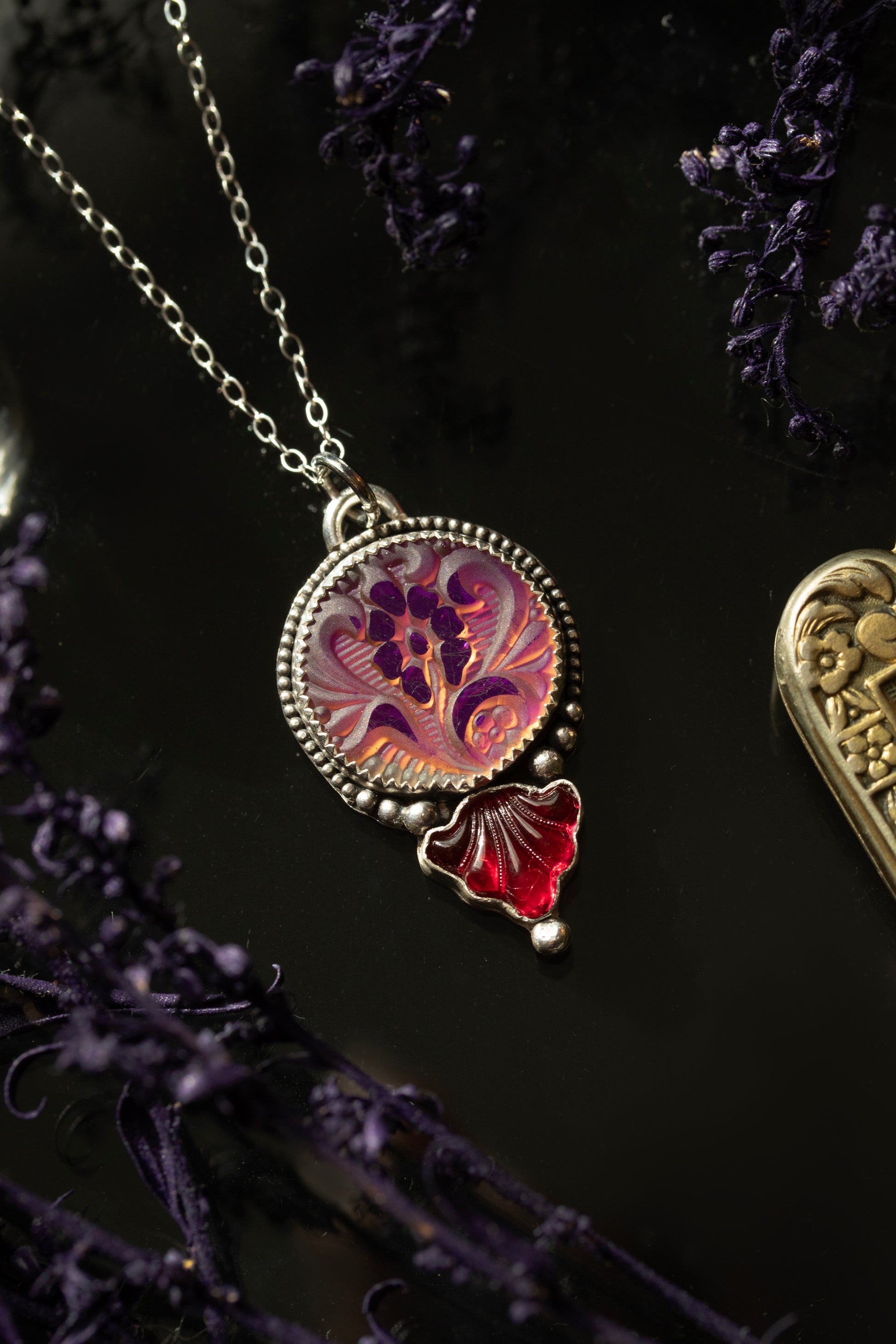 Handmade Art Nouveau inspired necklace with a metallic pink/orange flower cabochon & red glass Art Deco fan set in sterling & fine silver