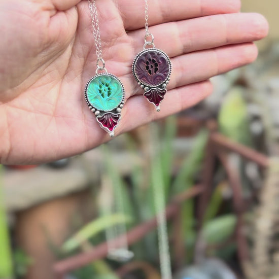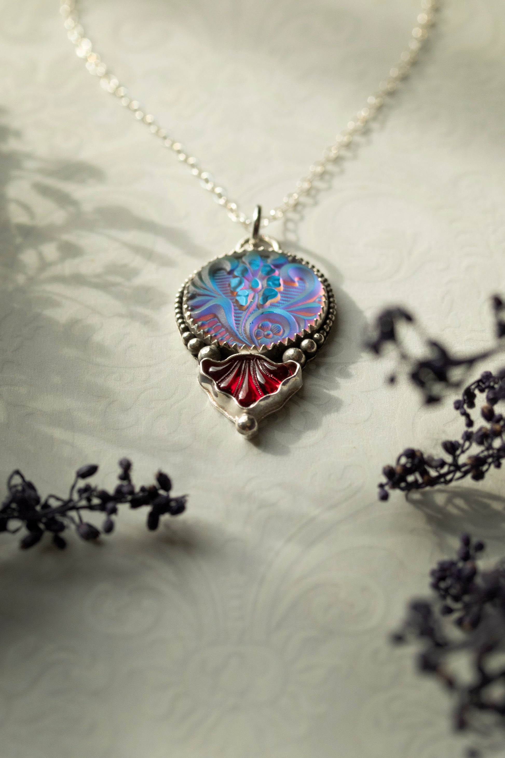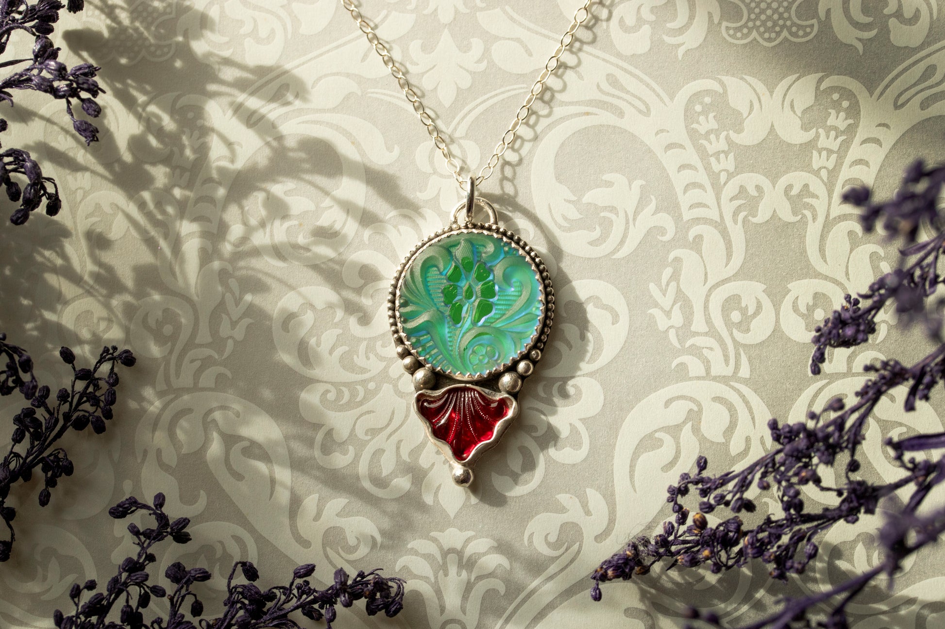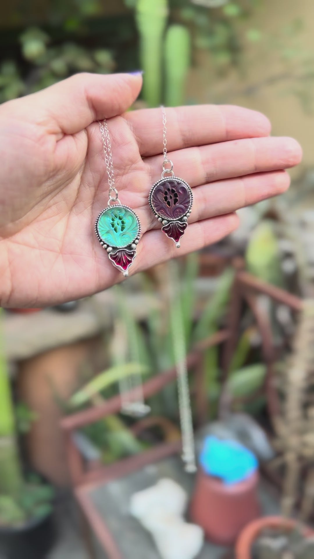 Handmade Art Nouveau inspired necklace with a metallic iridescent Green/Blue/Purple flower cabochon & red glass Art Deco fan set in sterling & fine silver