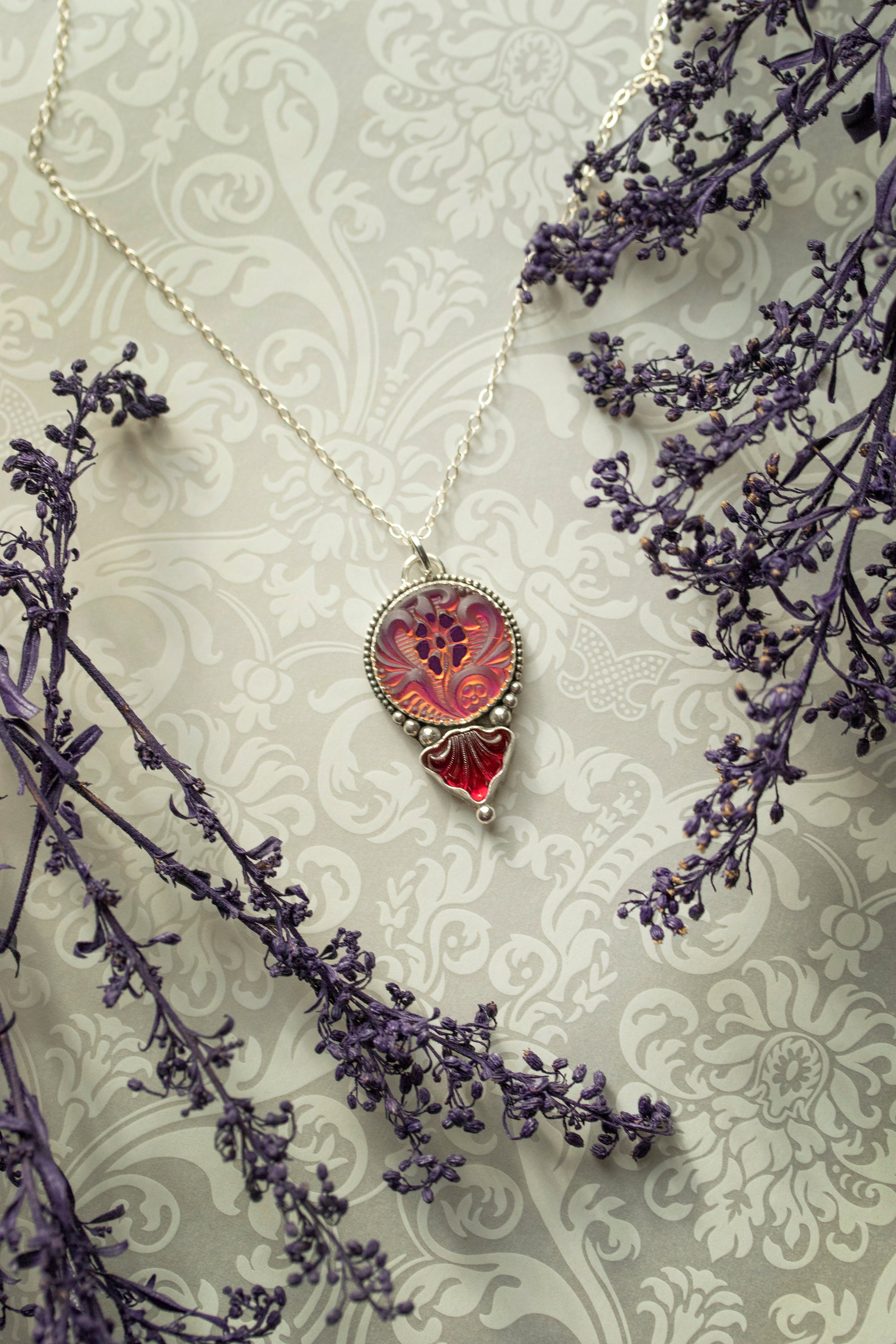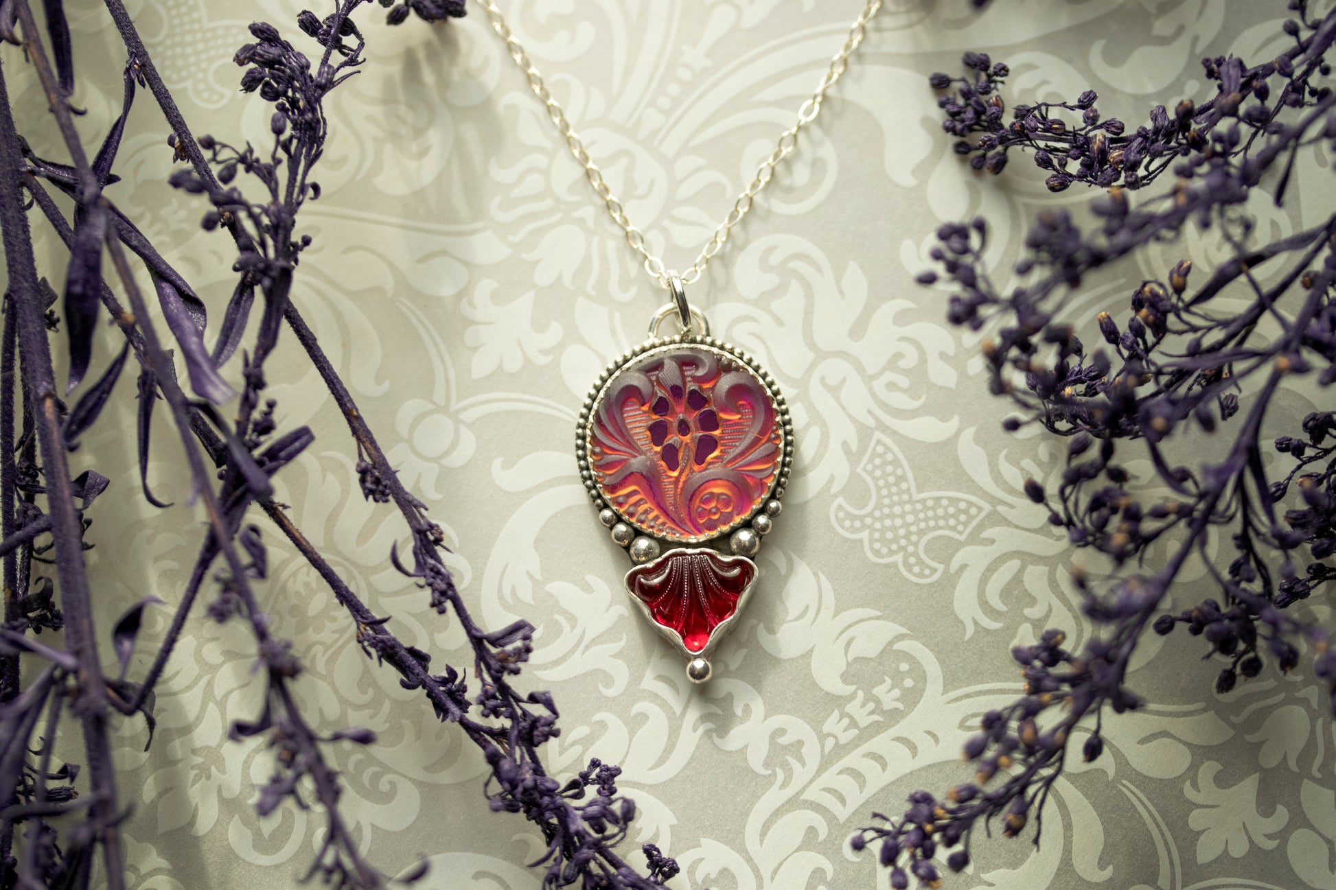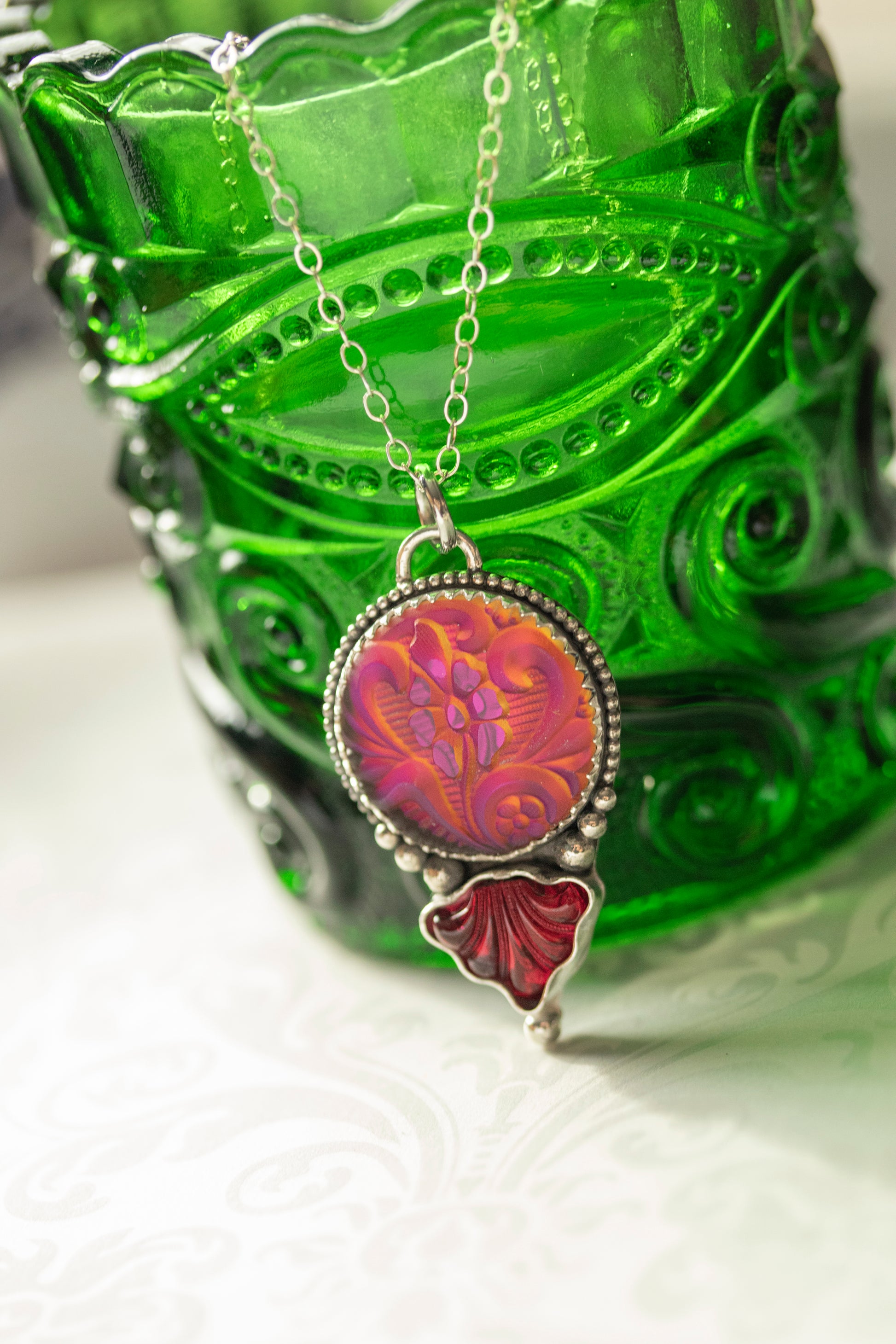 Handmade Art Nouveau inspired necklace with a metallic fuchsia pink/orange flower cabochon & red glass Art Deco fan set in sterling & fine silver
