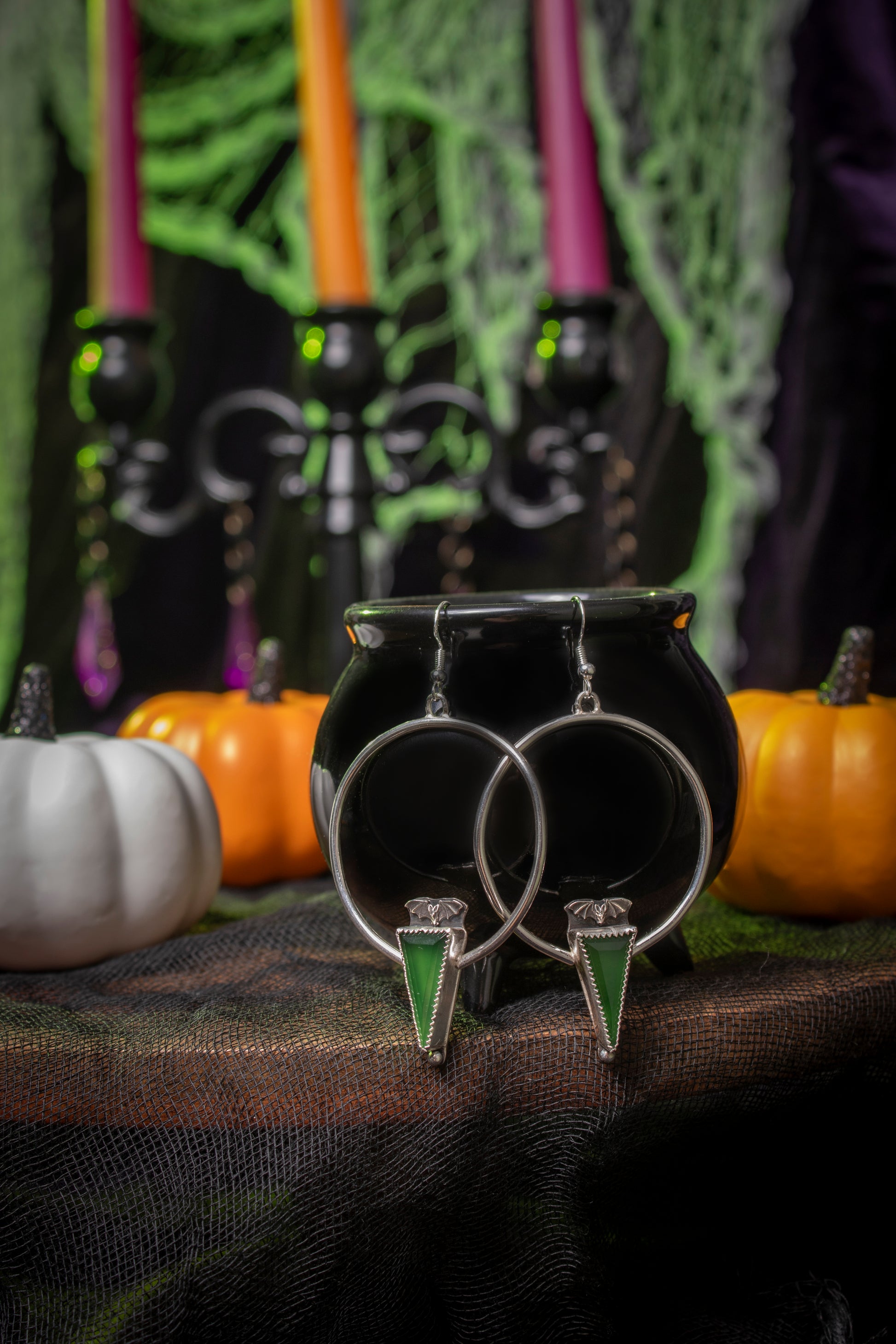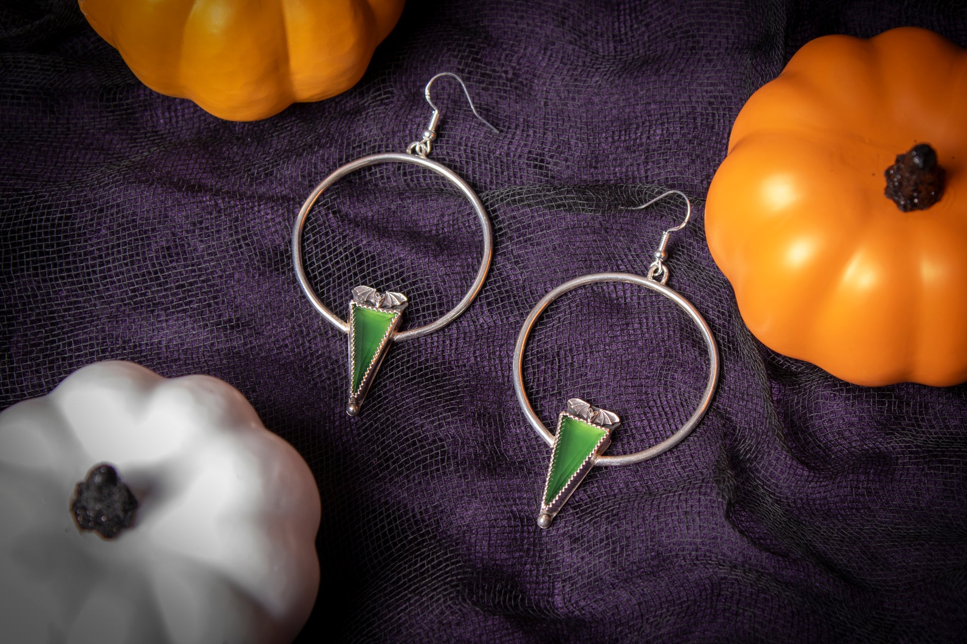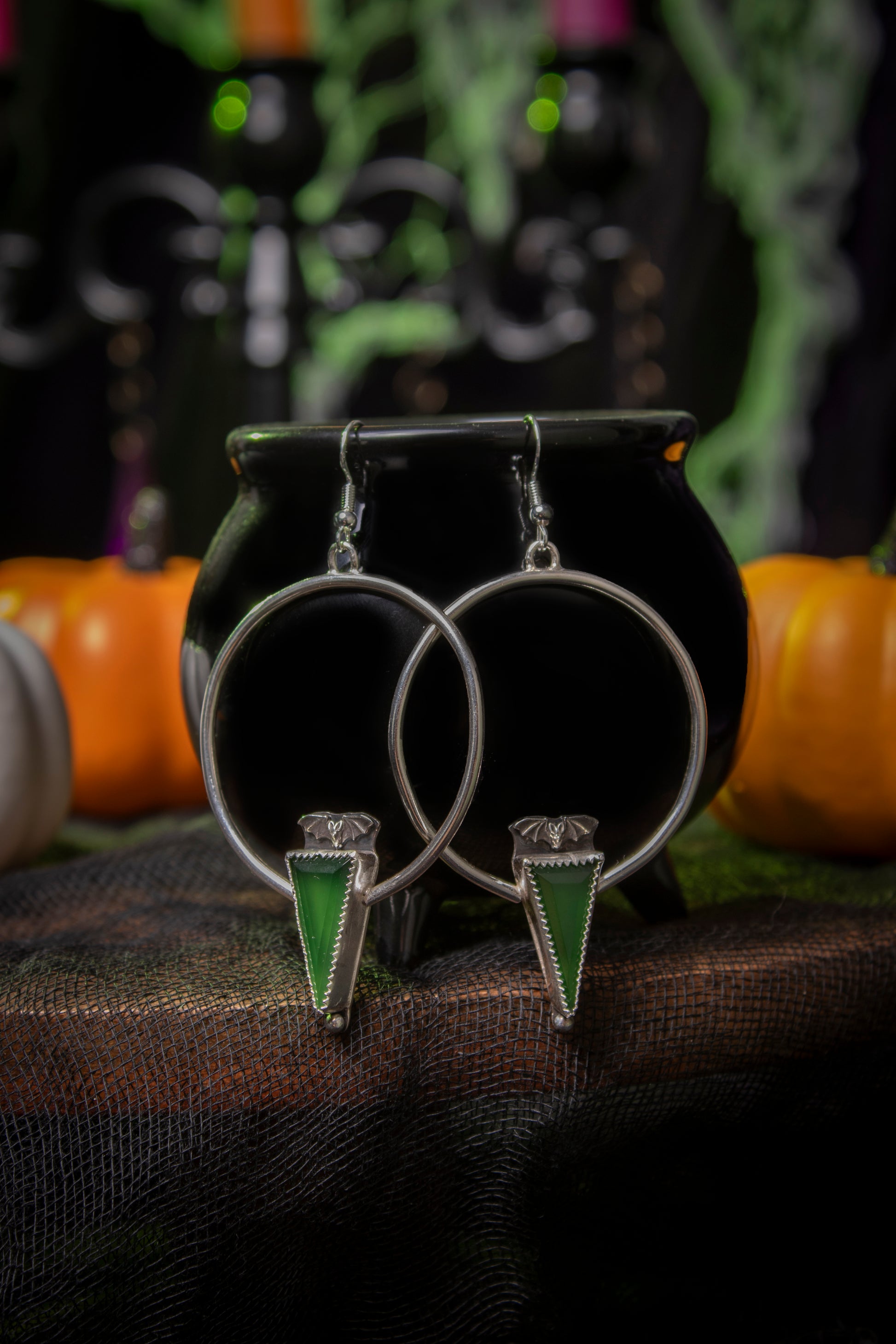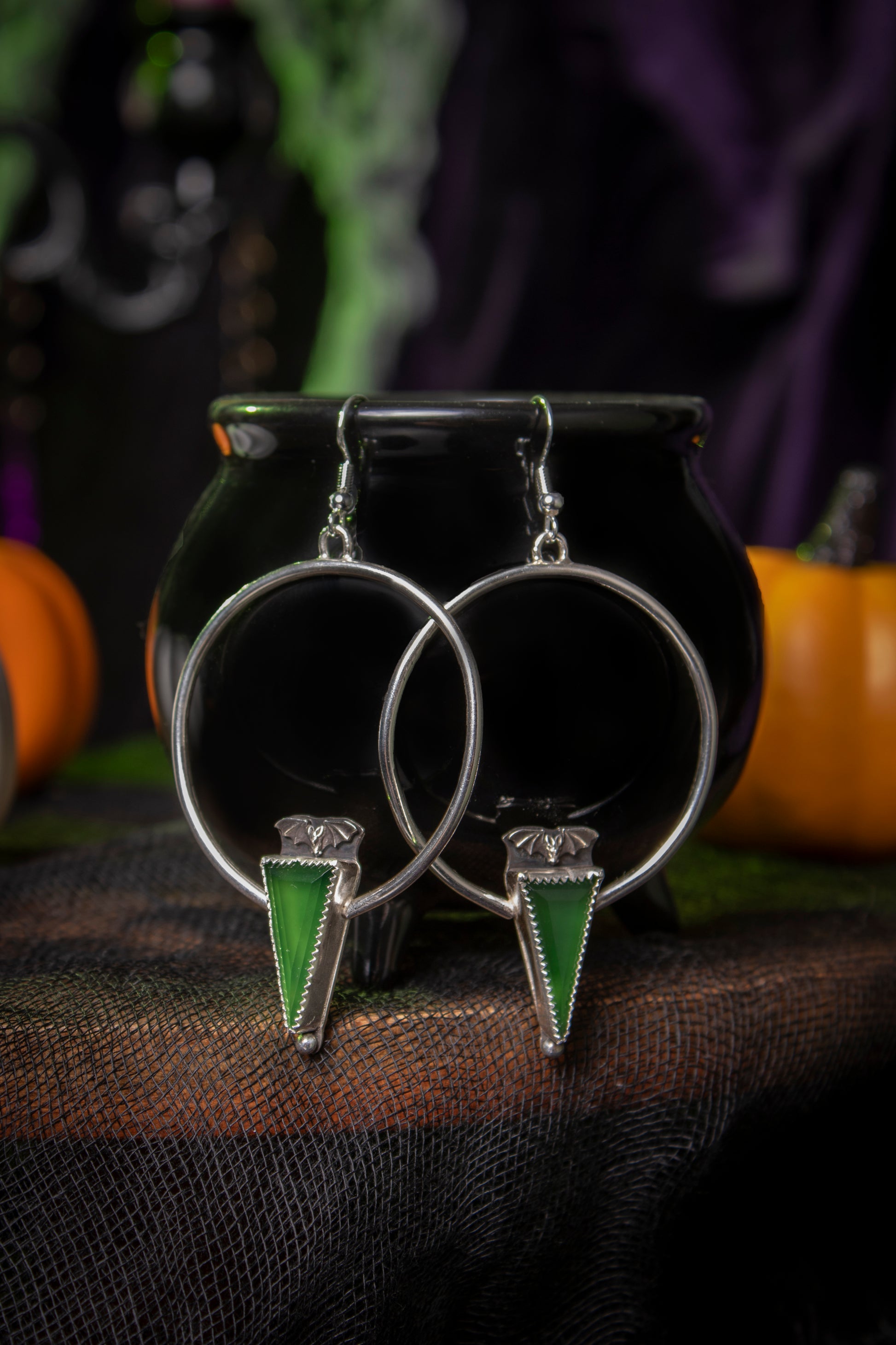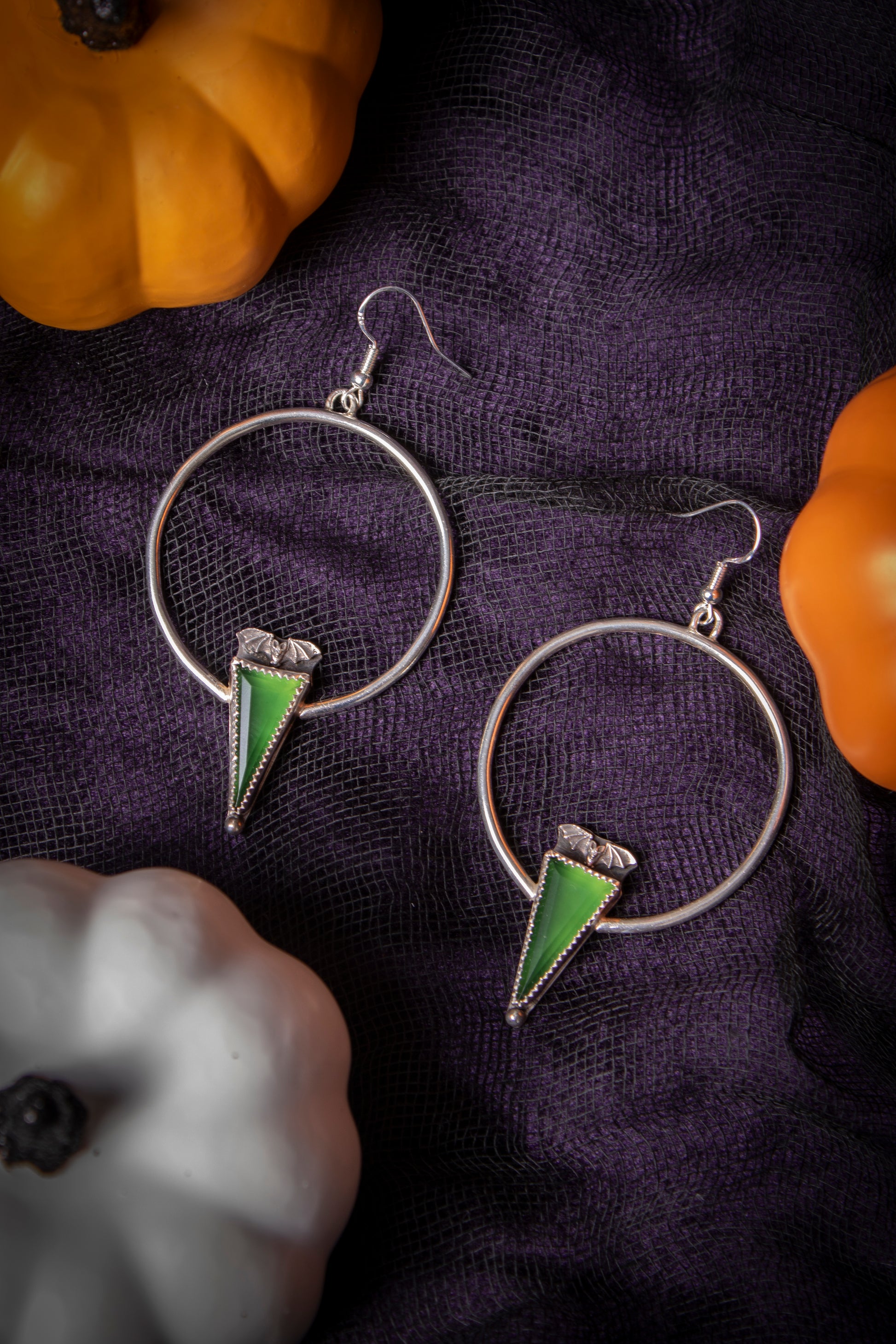 Green Serpentine stones set in fine silver bezels with sterling silver hoops and sterling bat details