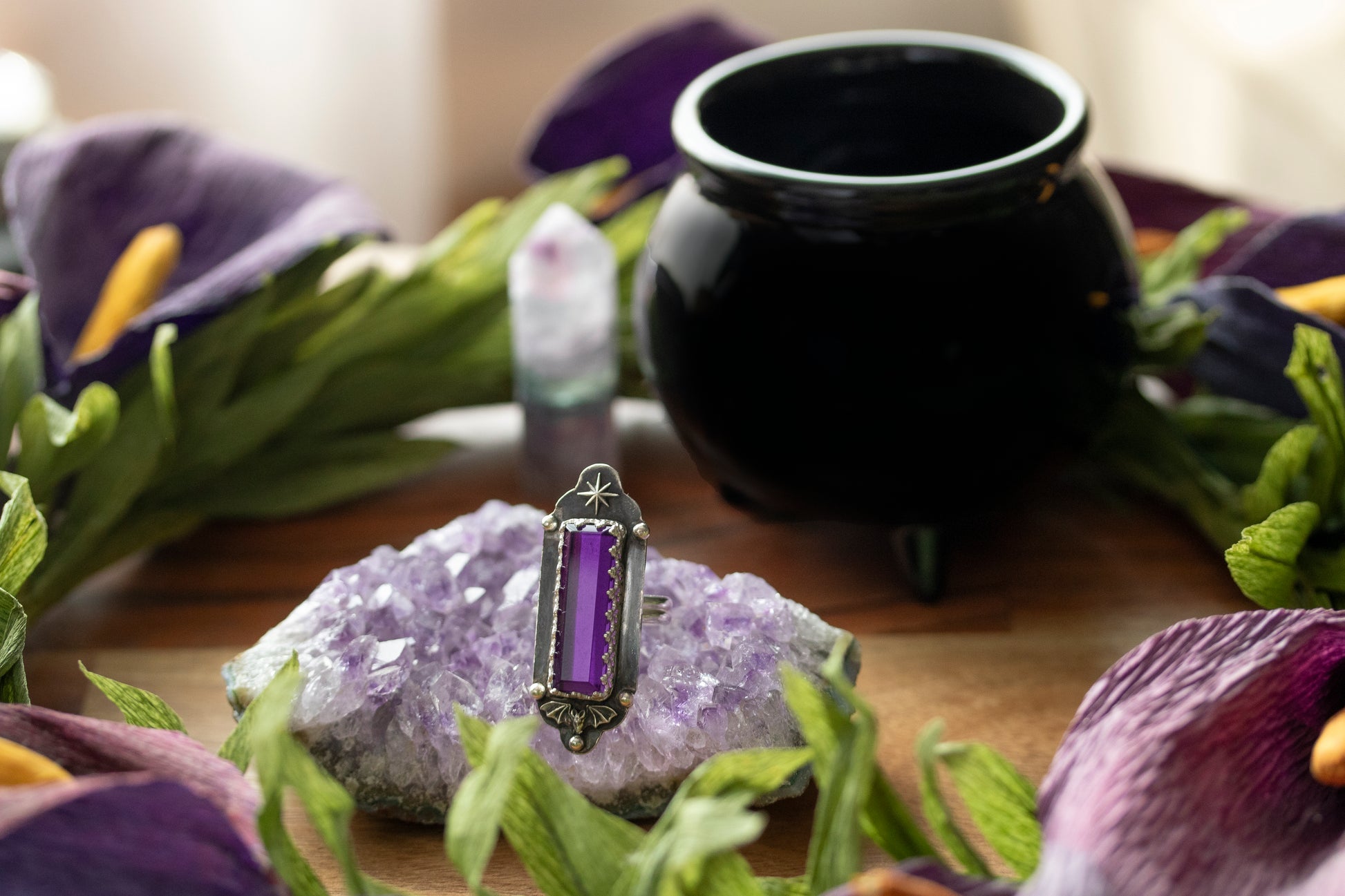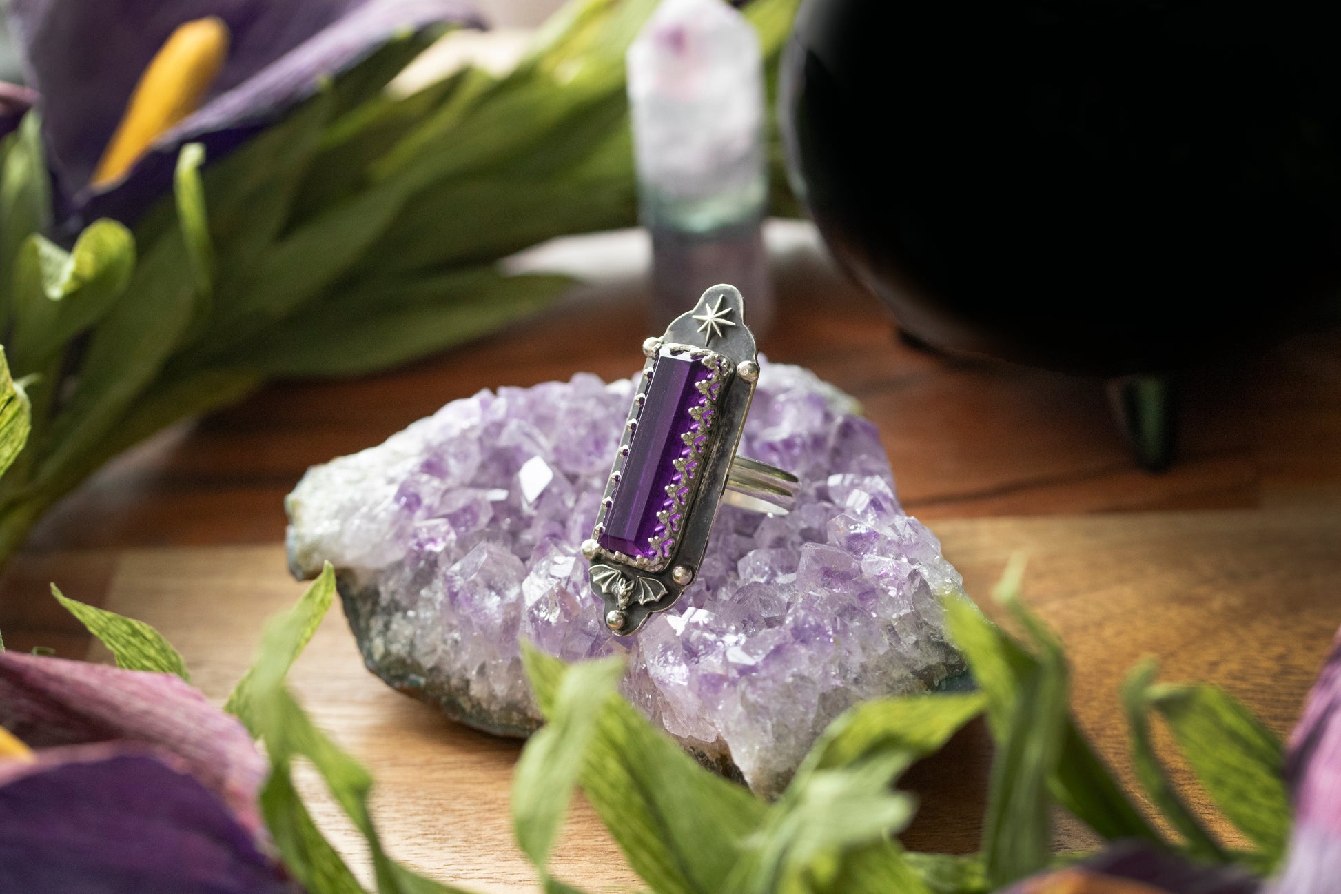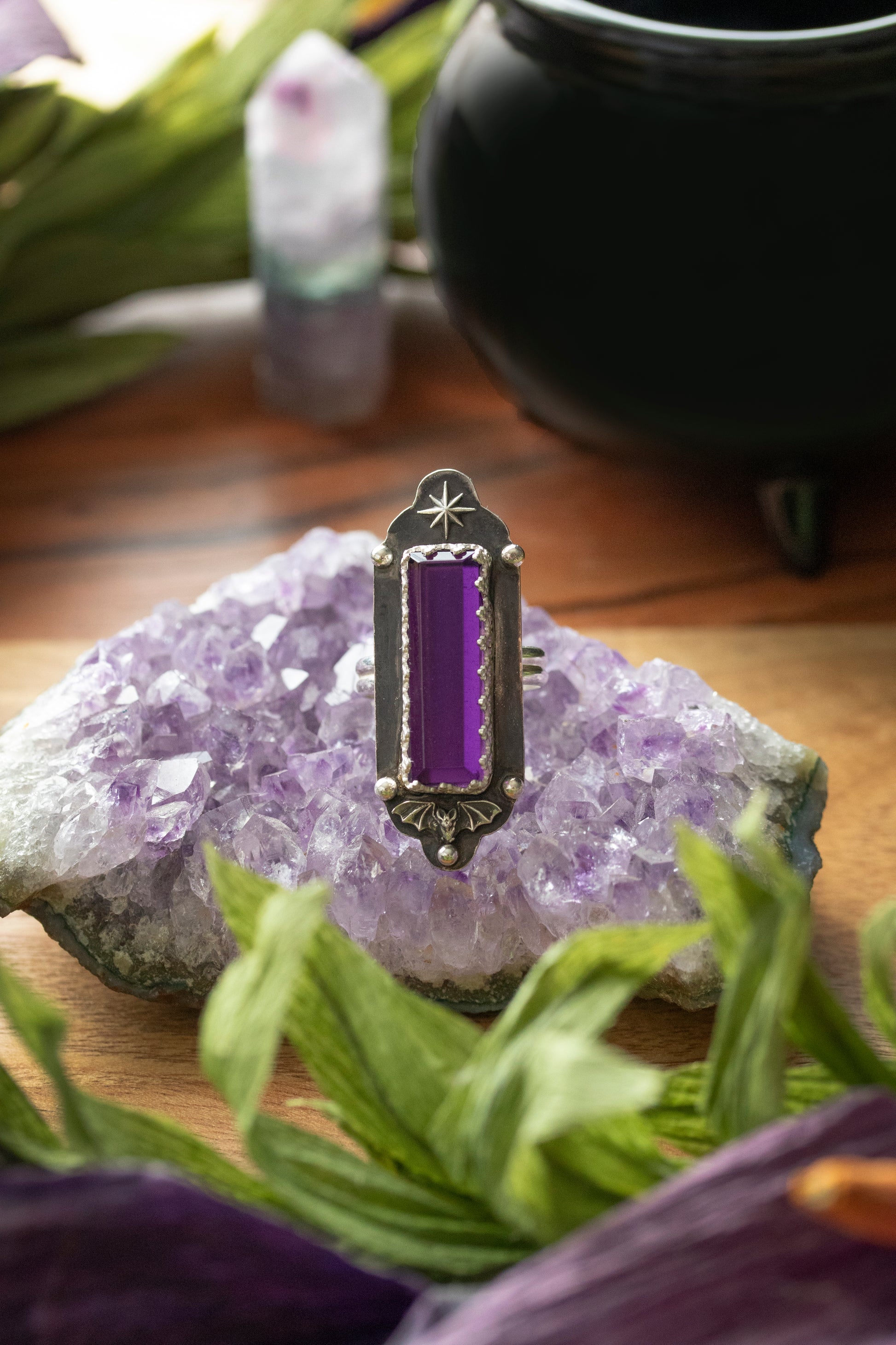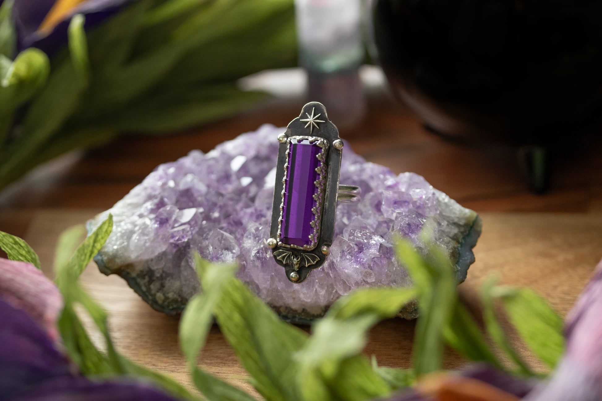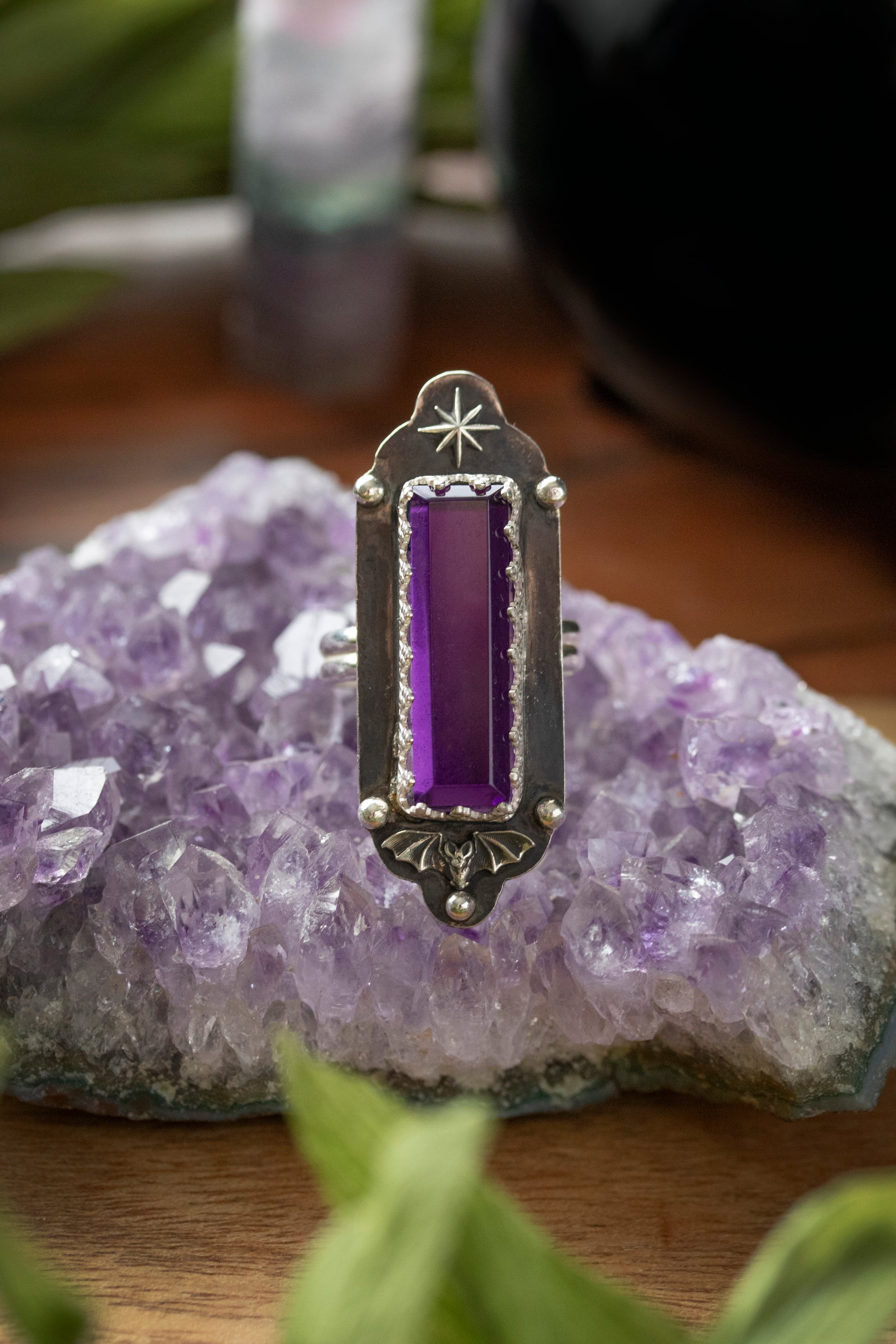 Handmade sterling and fine silver ring with an elongated purple amethyst stone. Sterling silver bat and star details