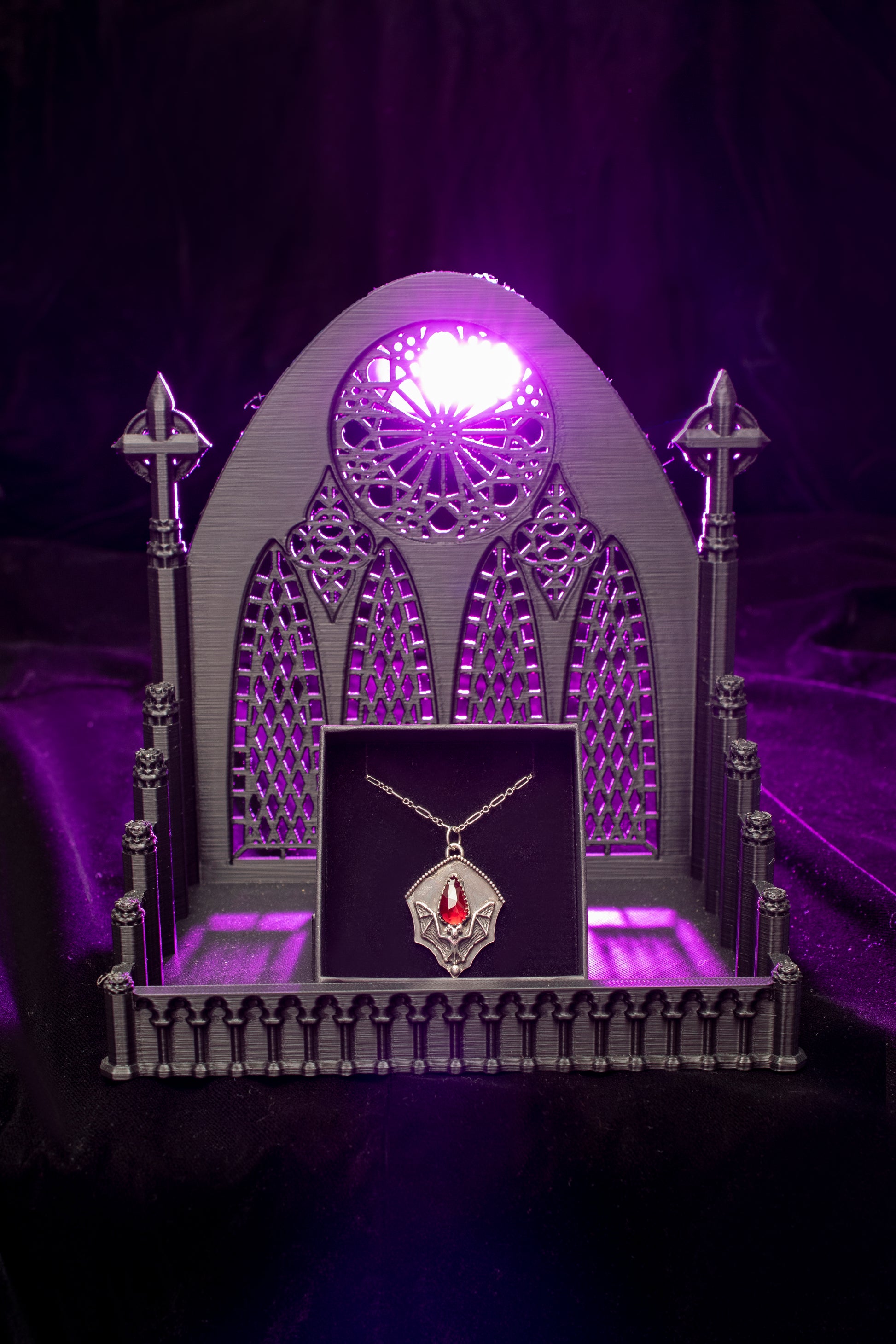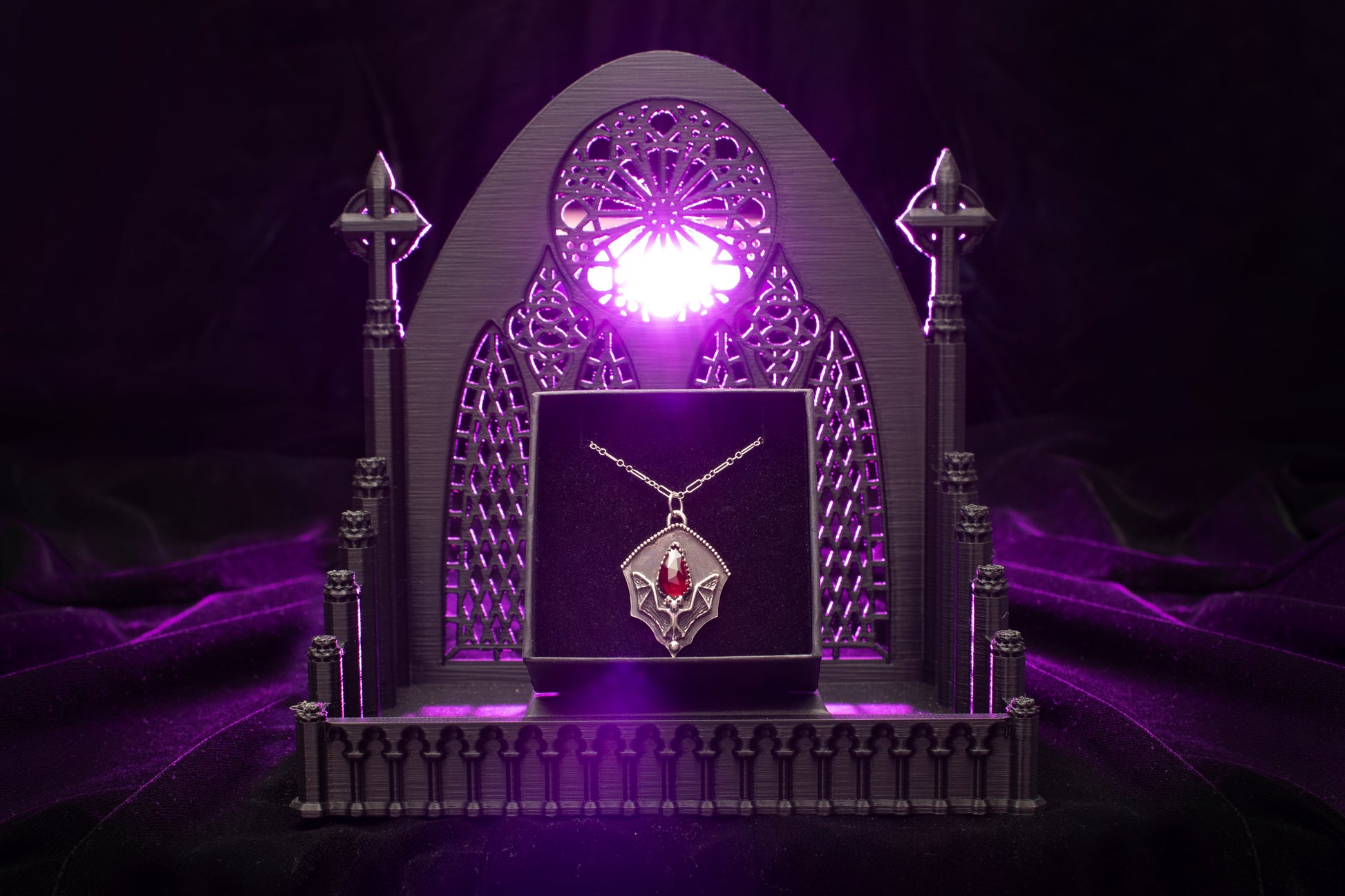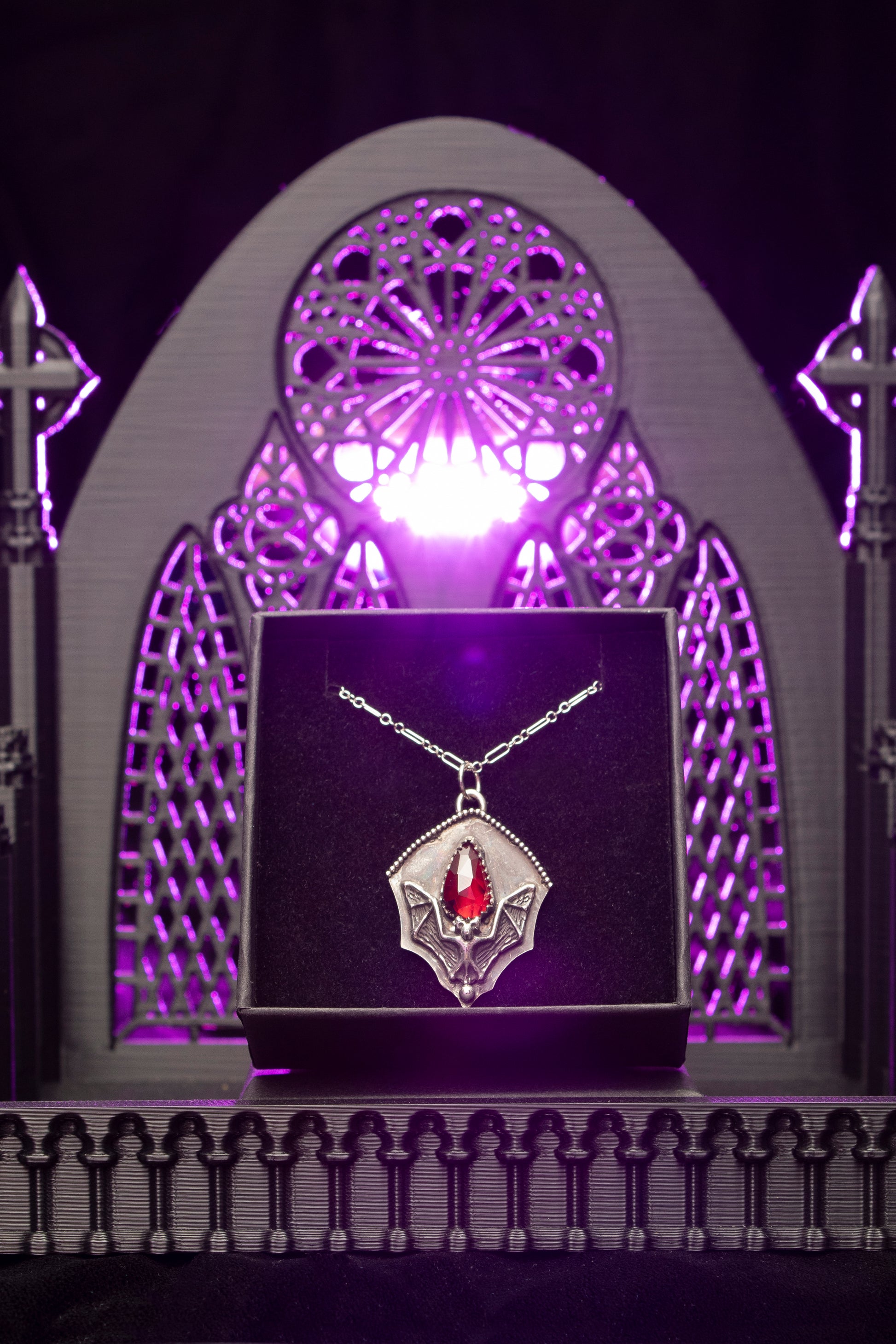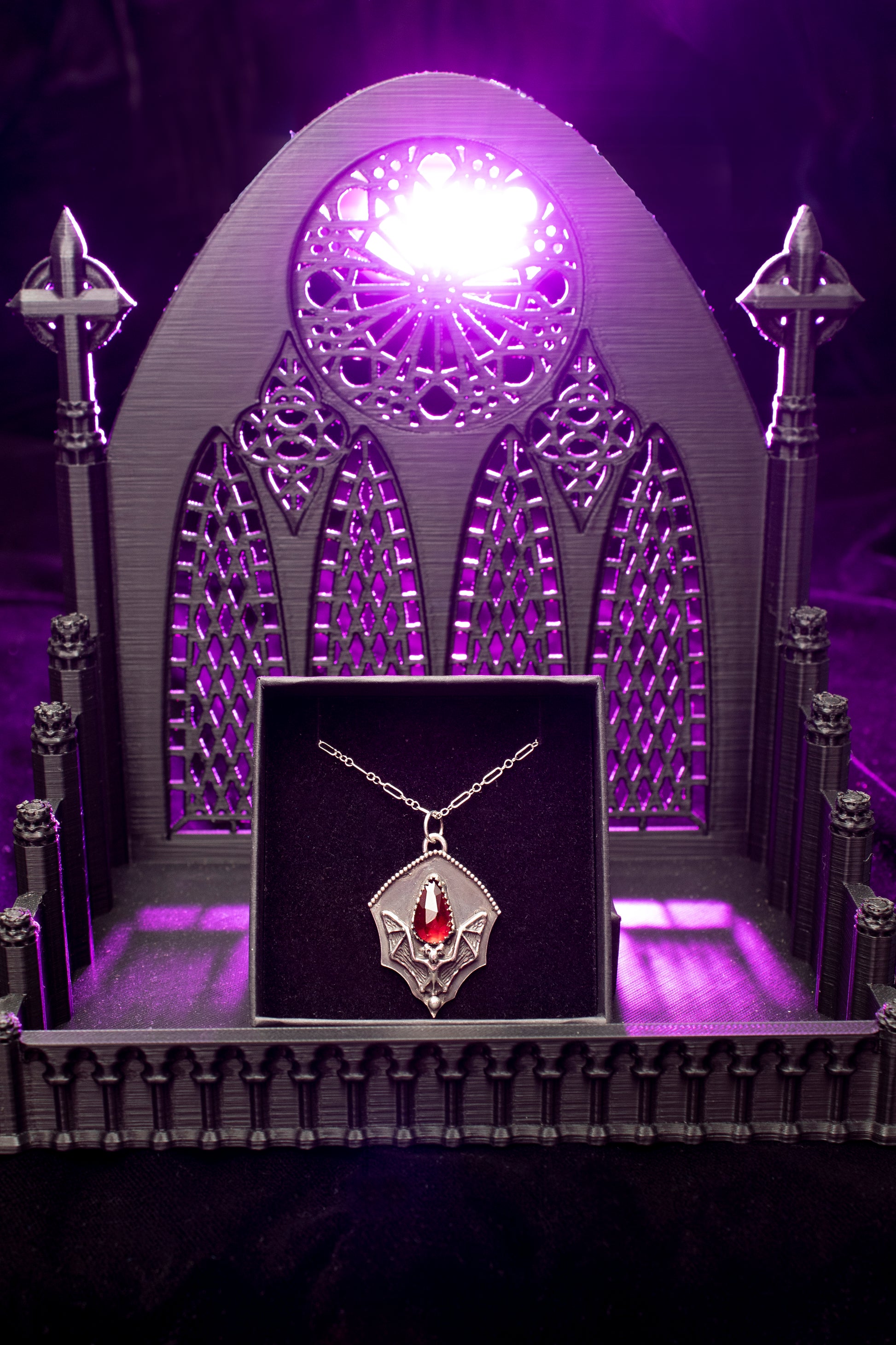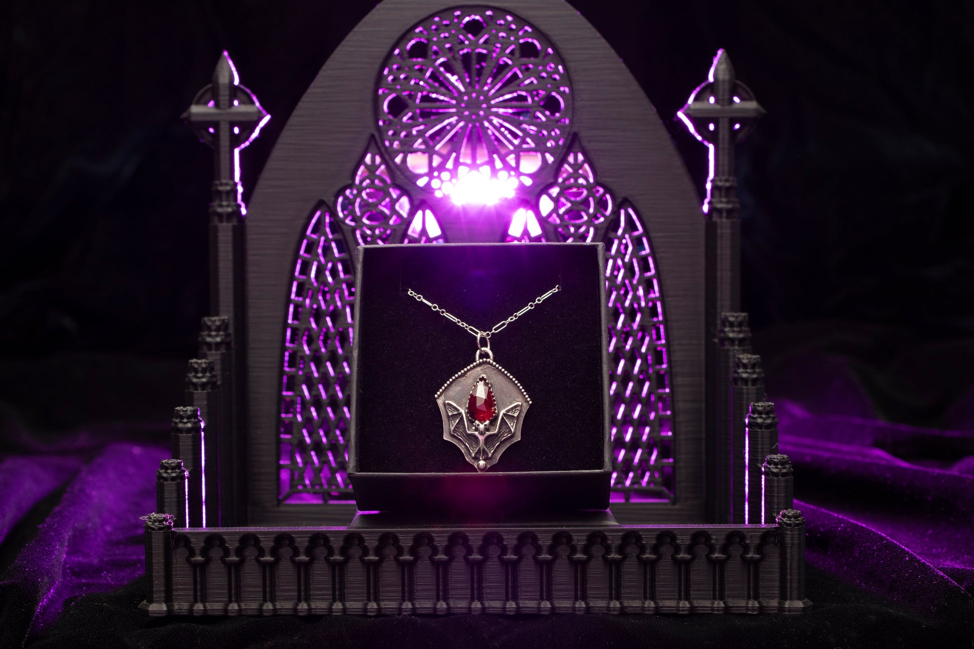 Red teardrop shaped garnet set in a fine silver bezel. Sterling silver bat casting and sterling silver details and backplate. Named in memorial for the late, great Ozzy Osbourne!