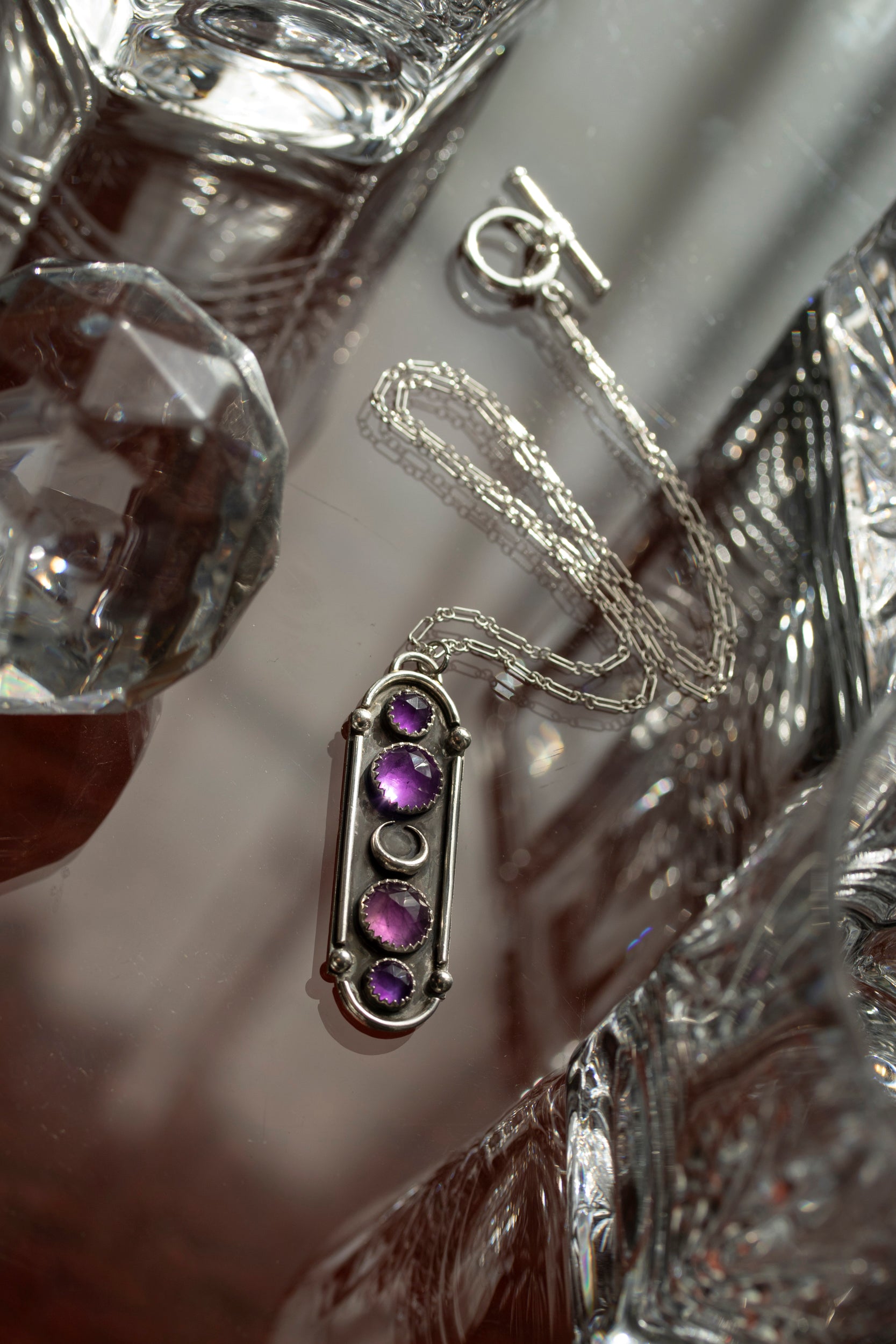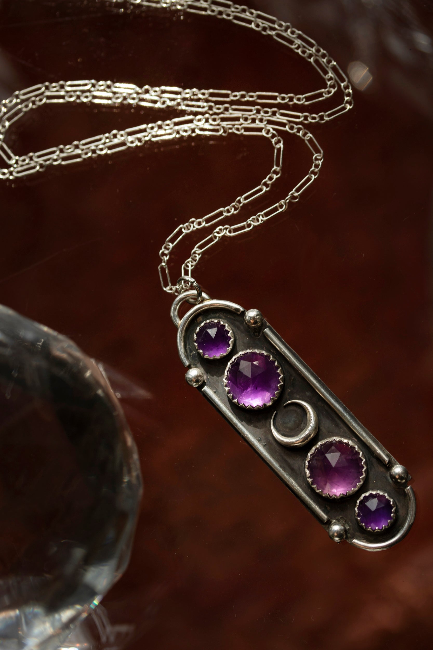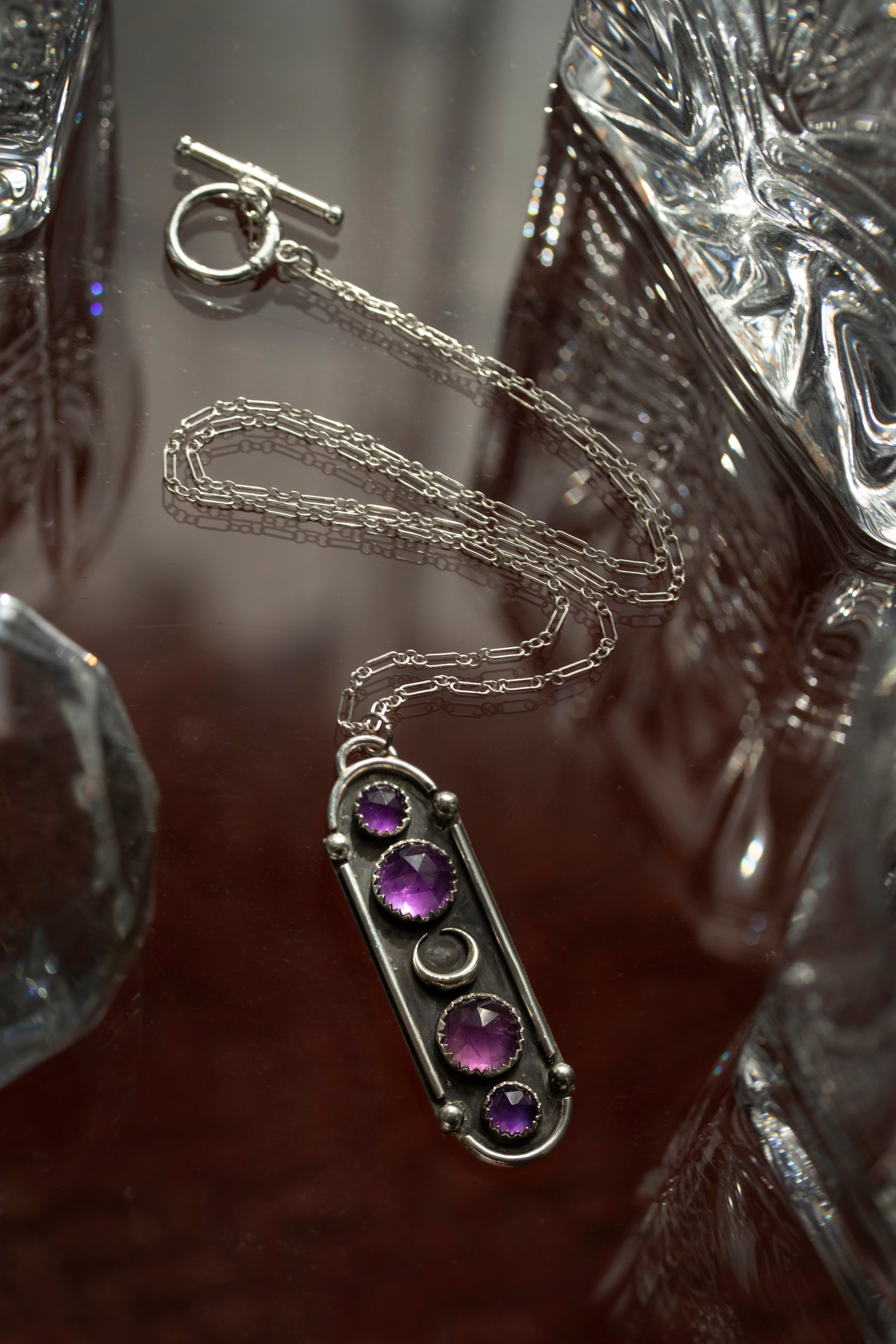Handmade sterling and fine silver vintage inspired necklace with four amethysts and sterling silver moon detail