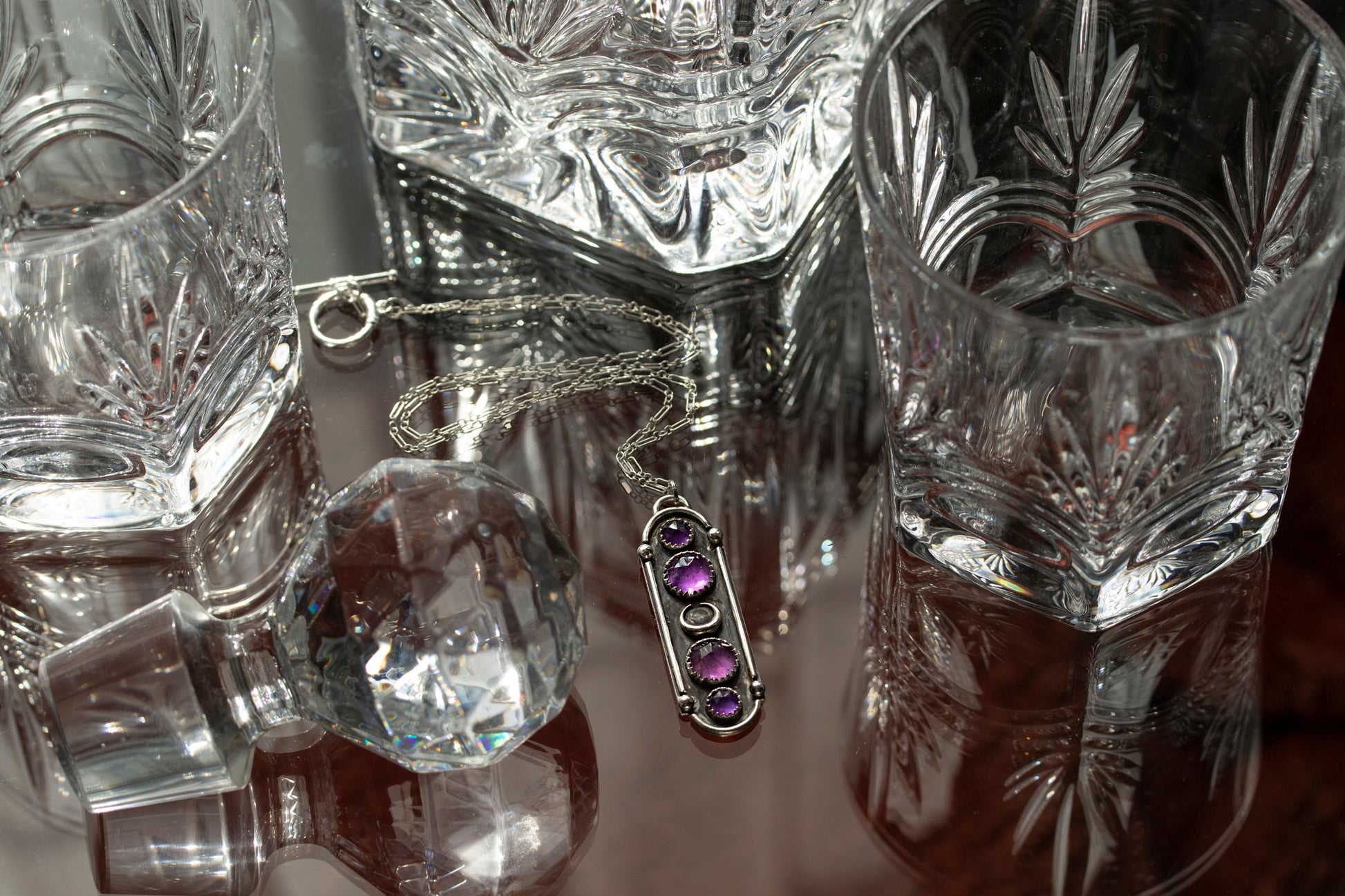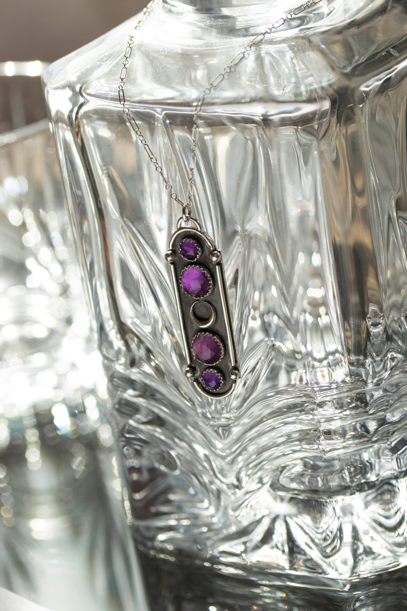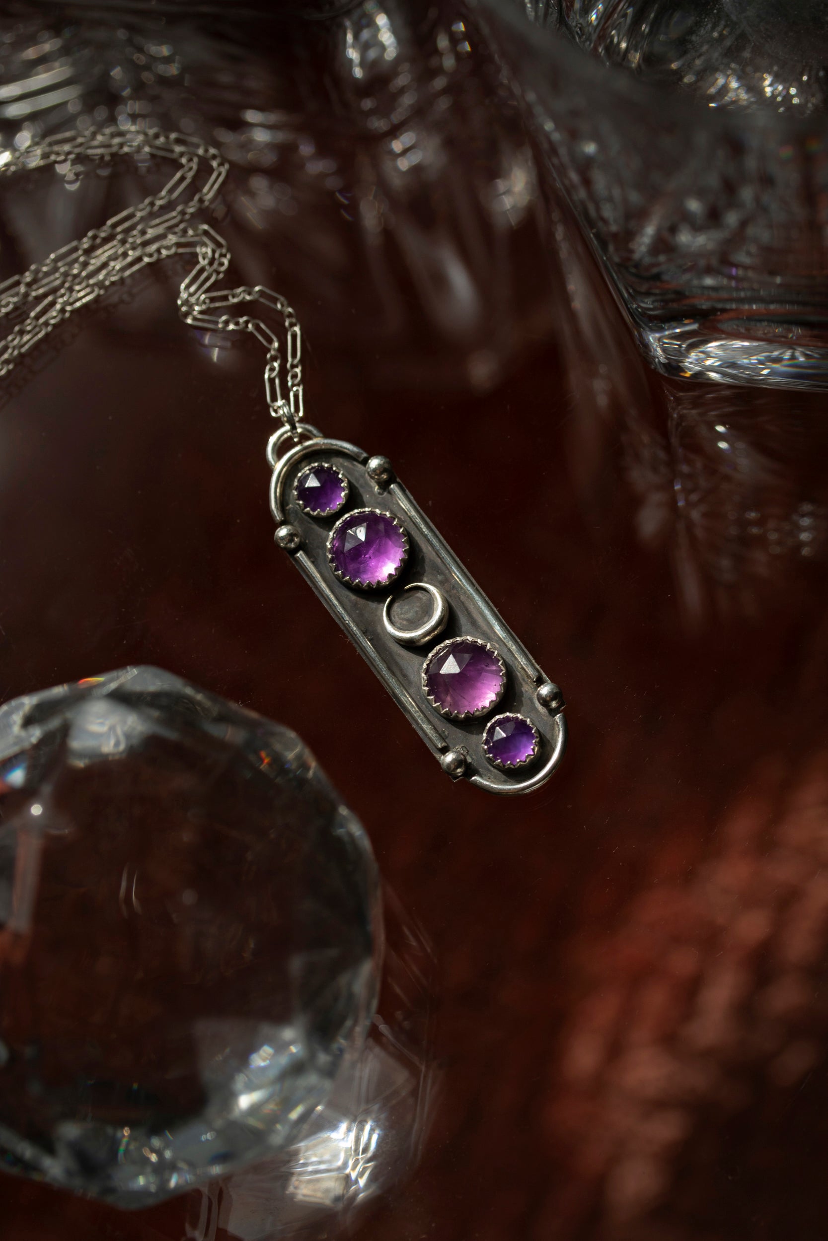 Handmade sterling and fine silver vintage inspired necklace with four amethysts and sterling silver moon detail