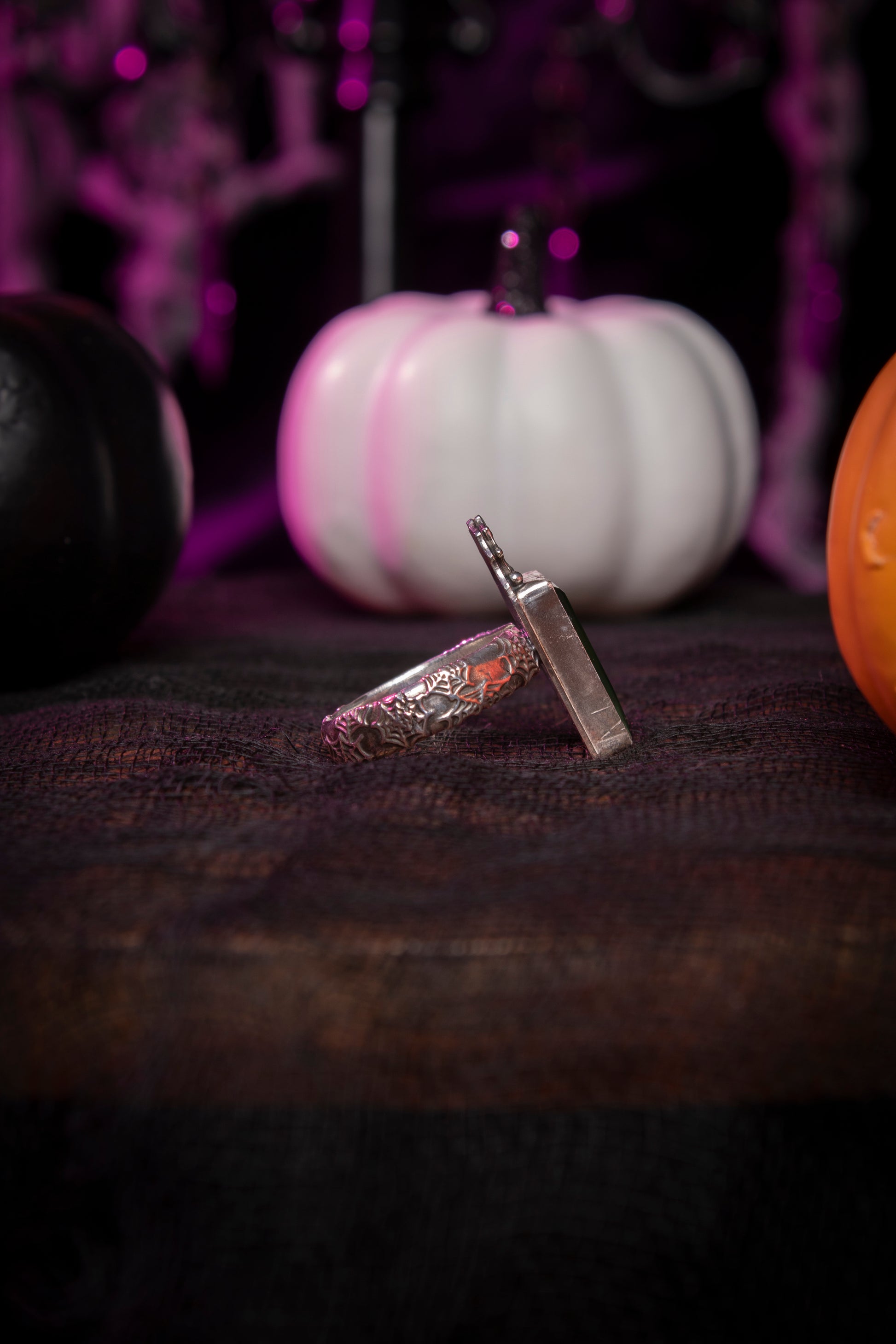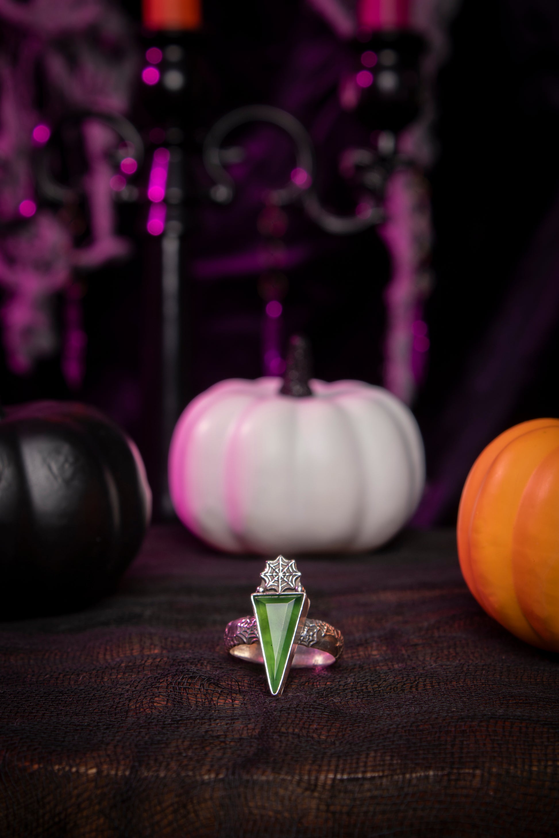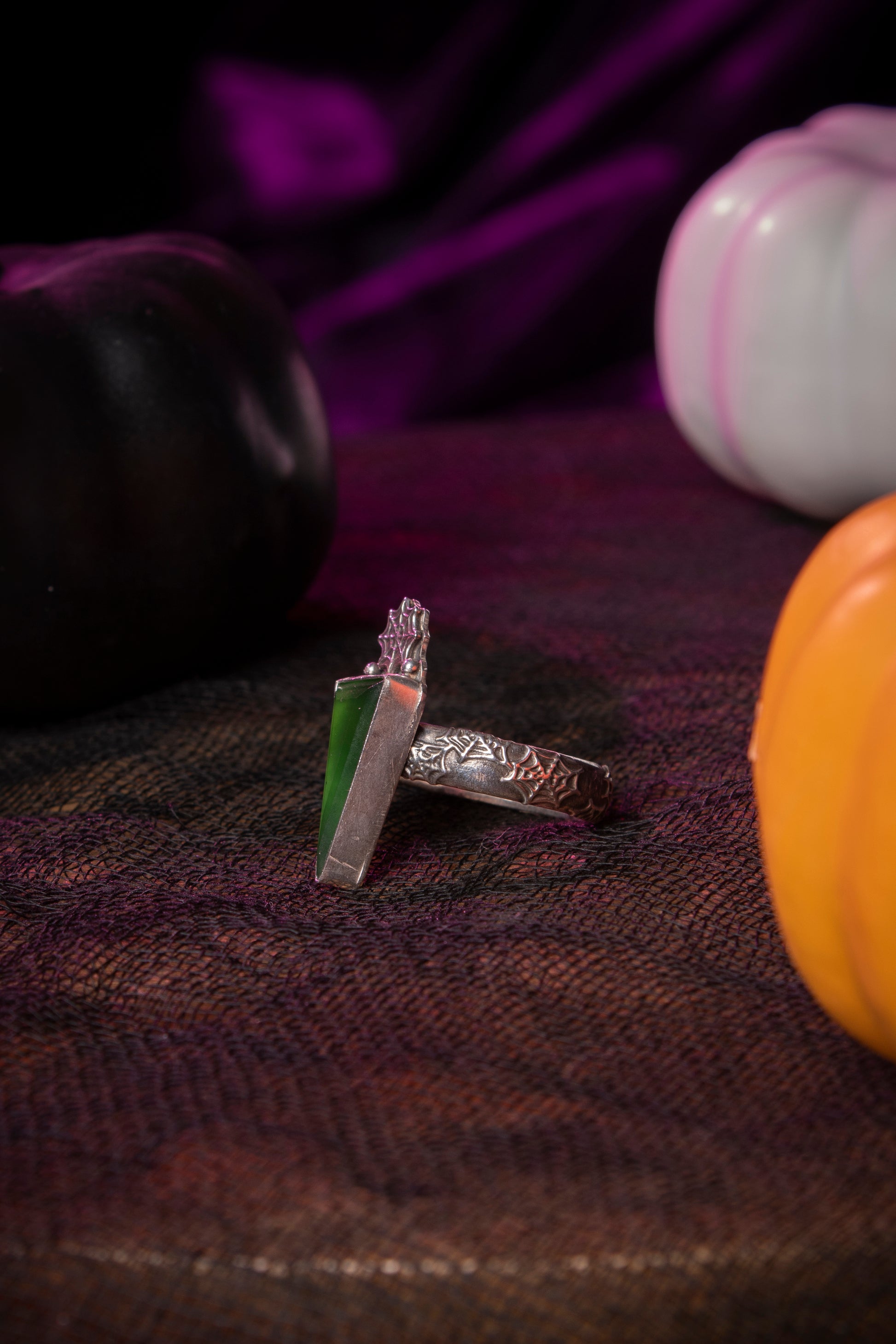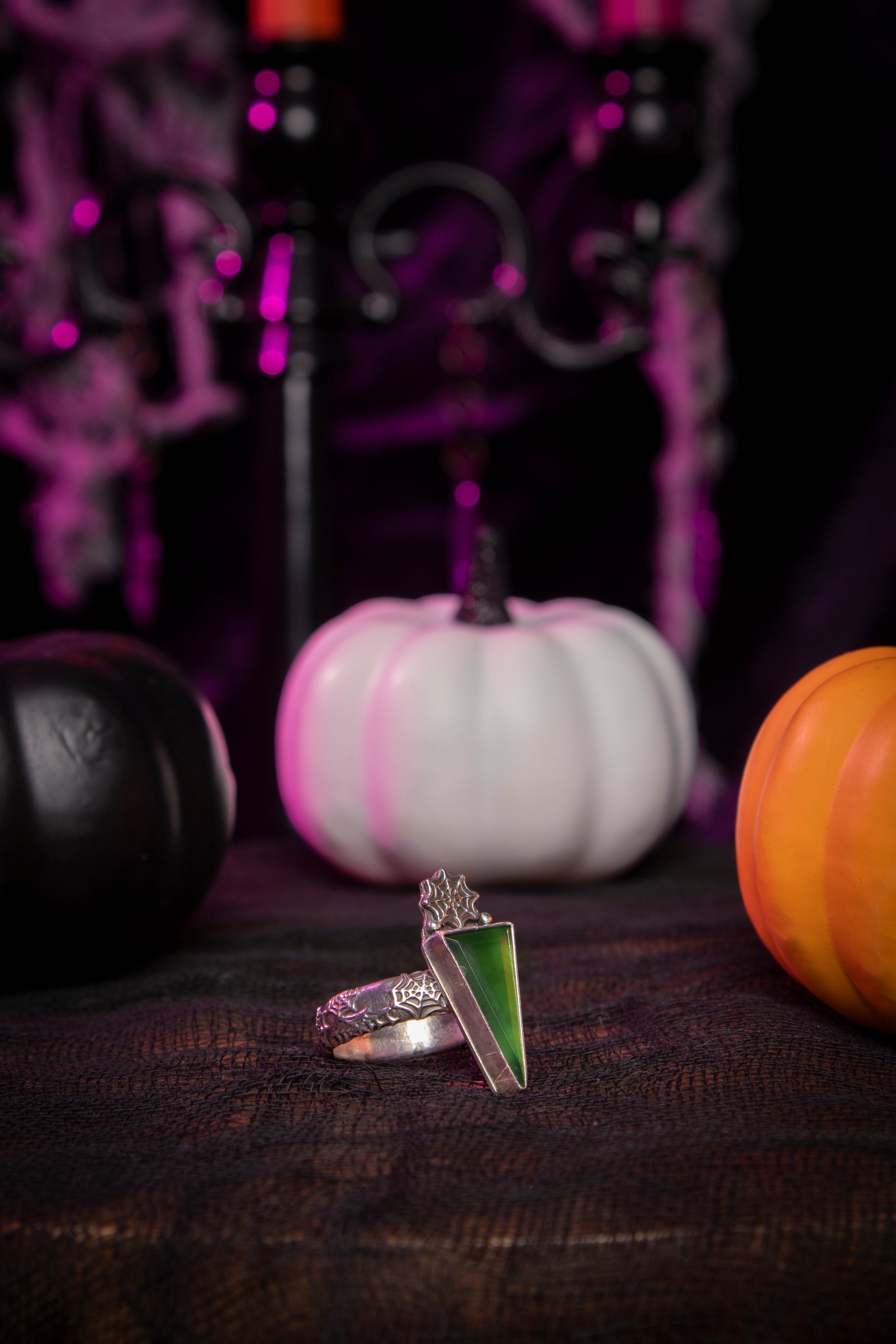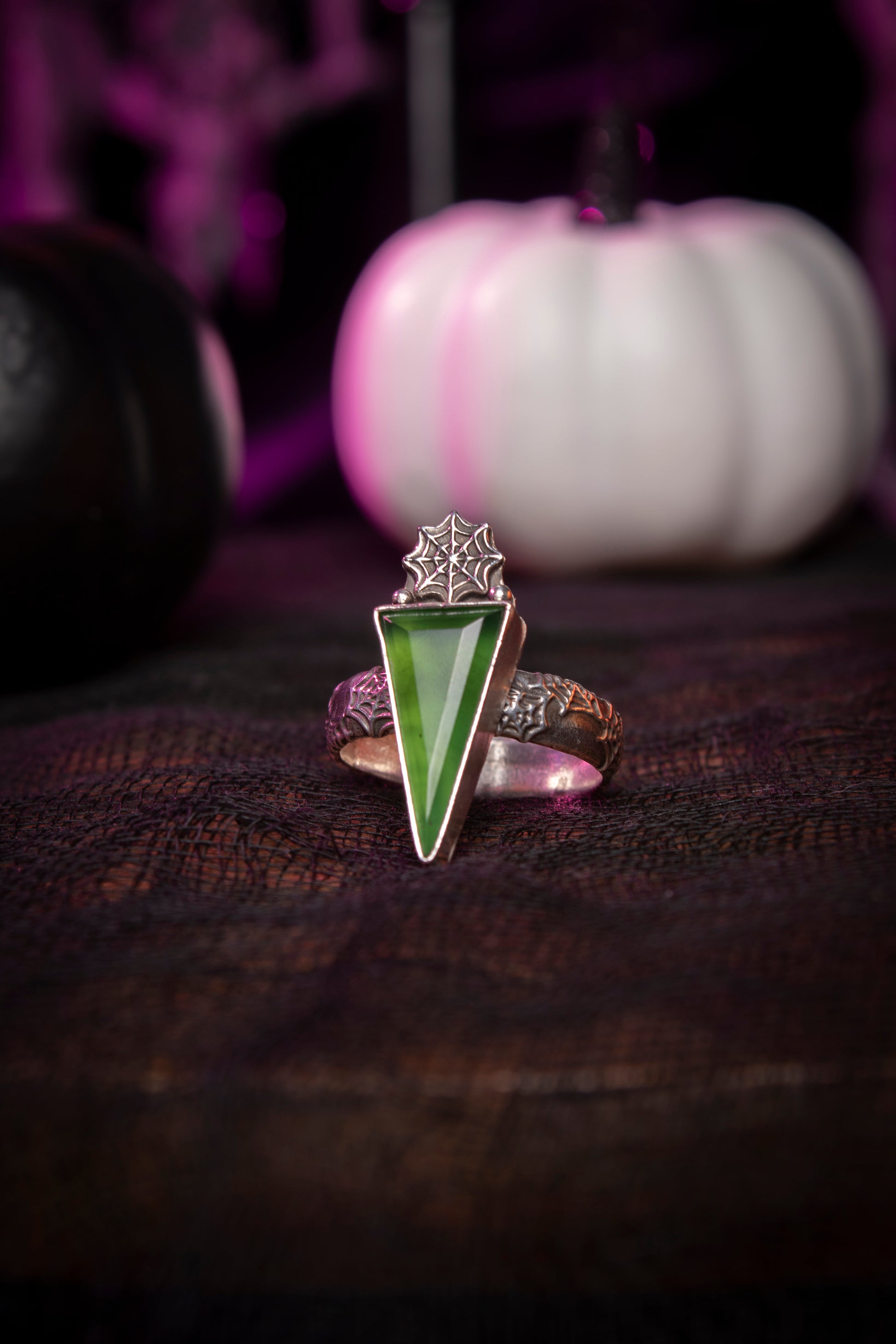 Green Serpentine stone set in a fine silver bezel, with a sterling silver spiderweb detail and sterling silver spiderweb ring band.