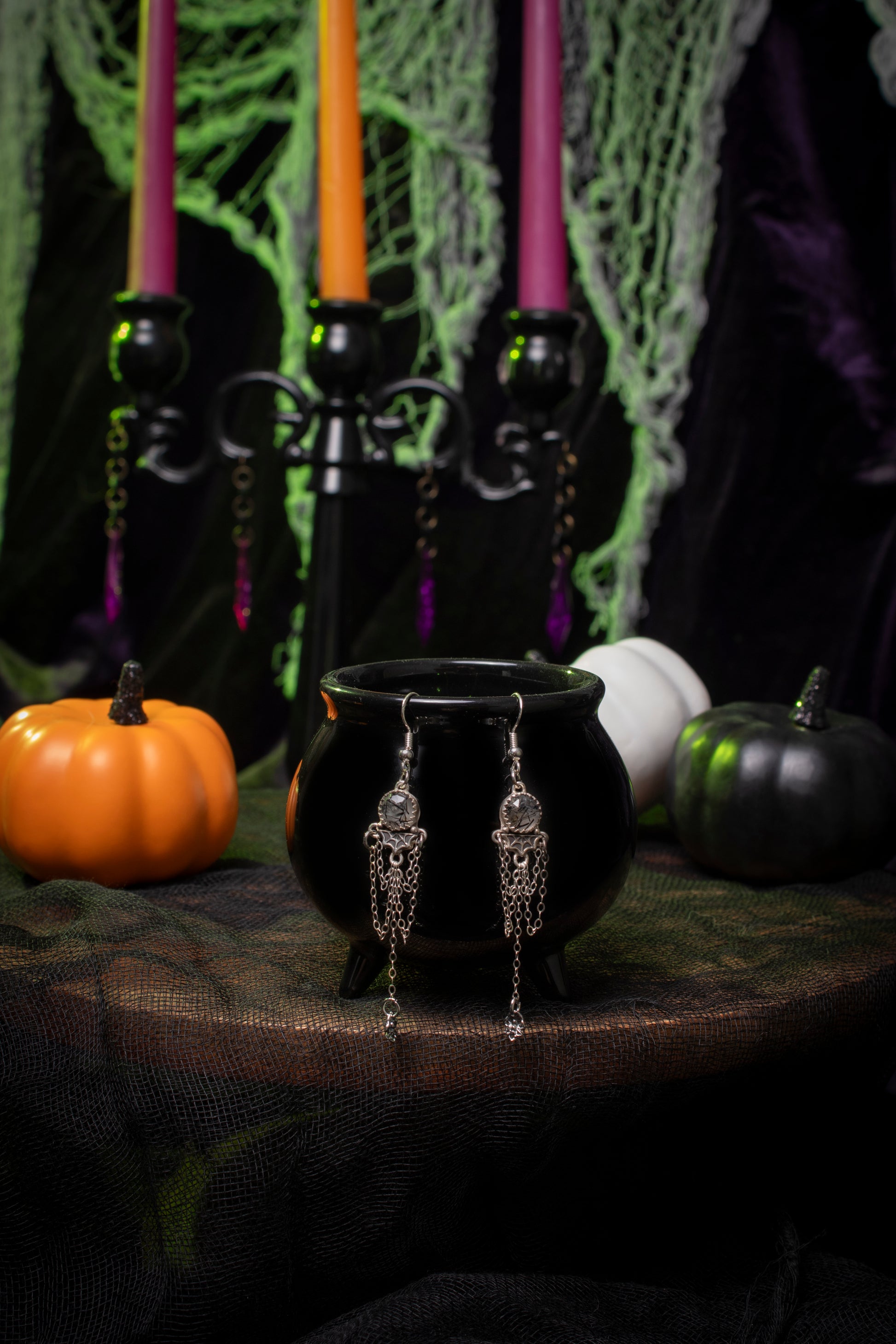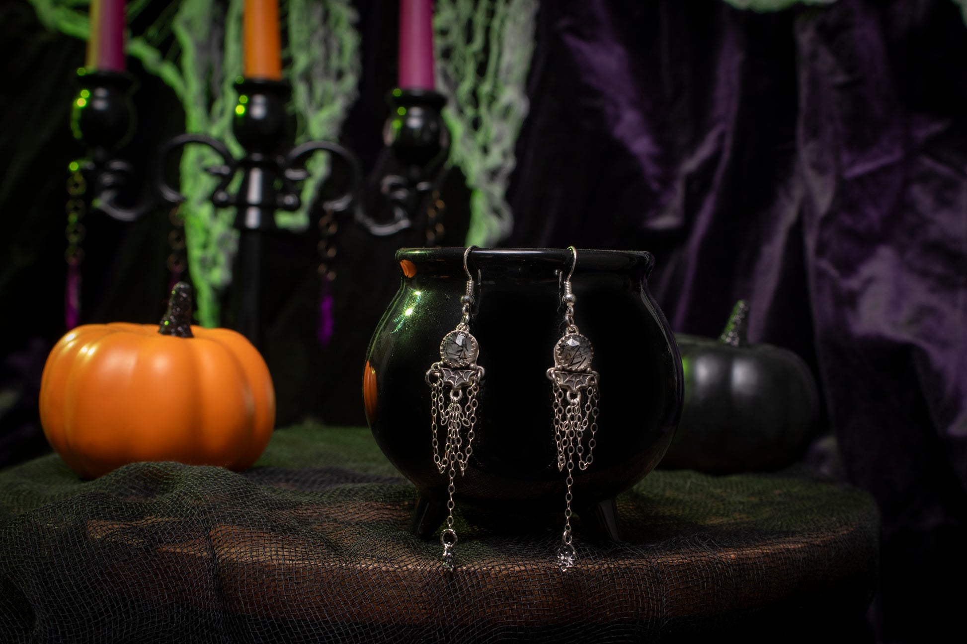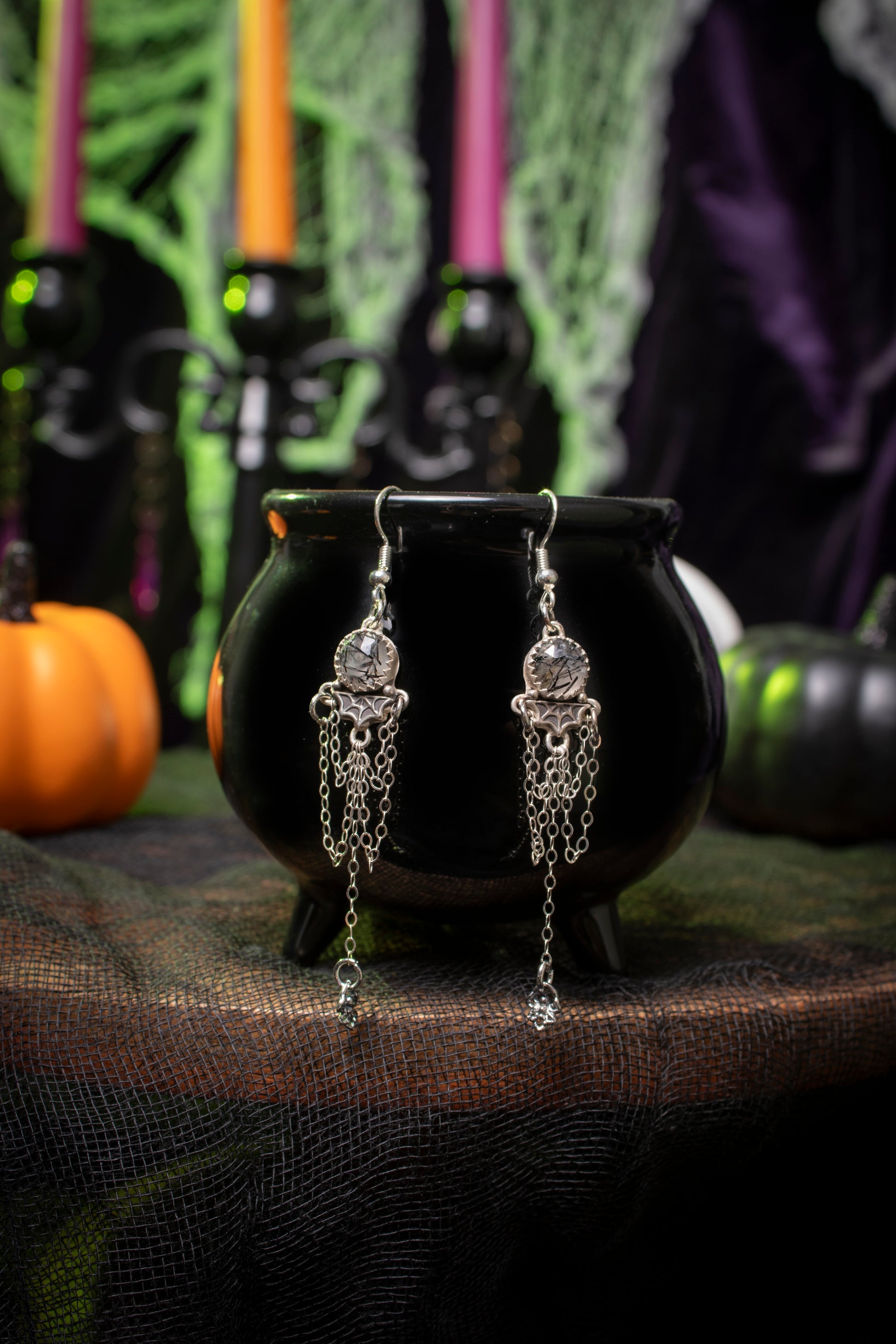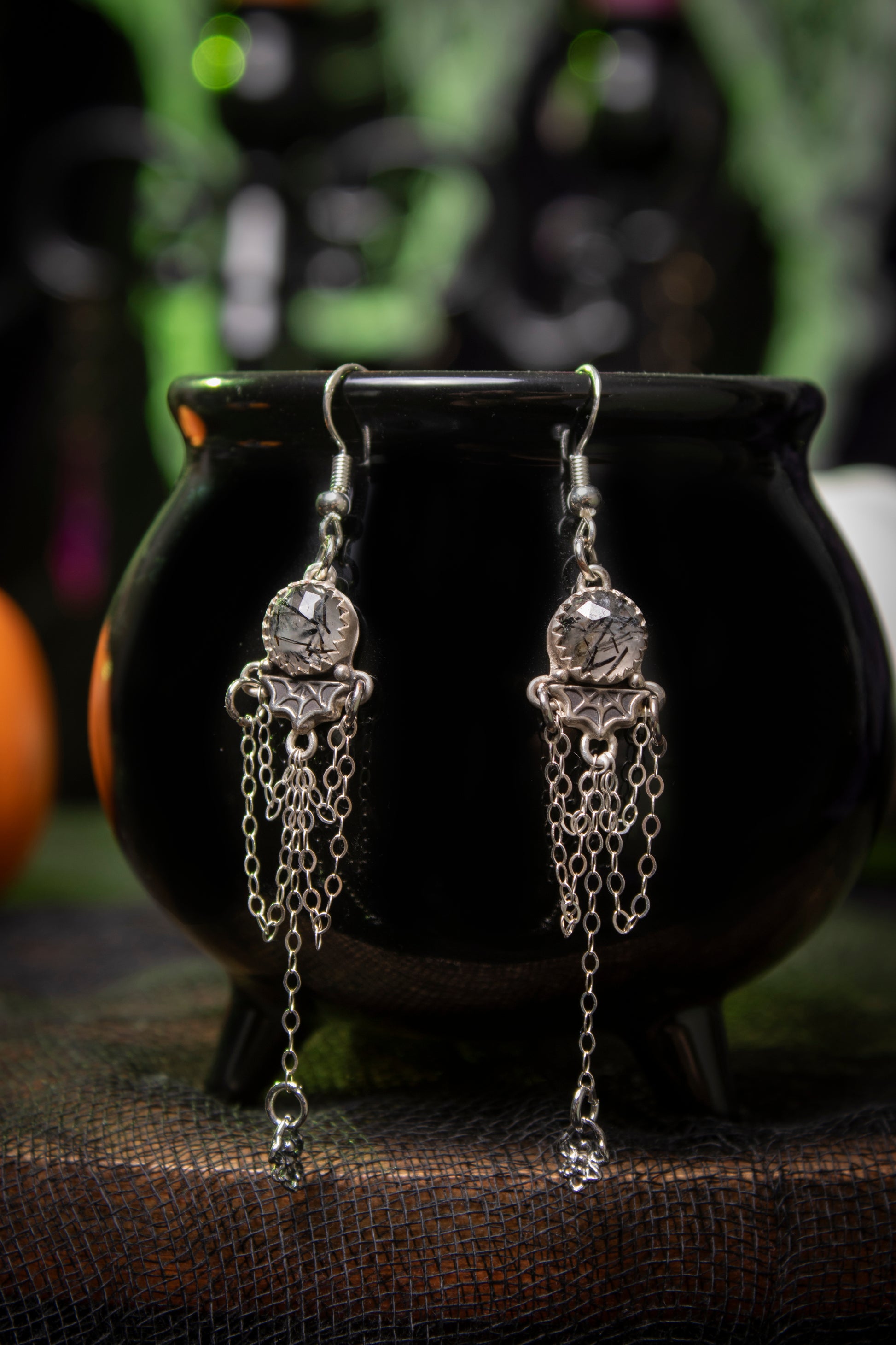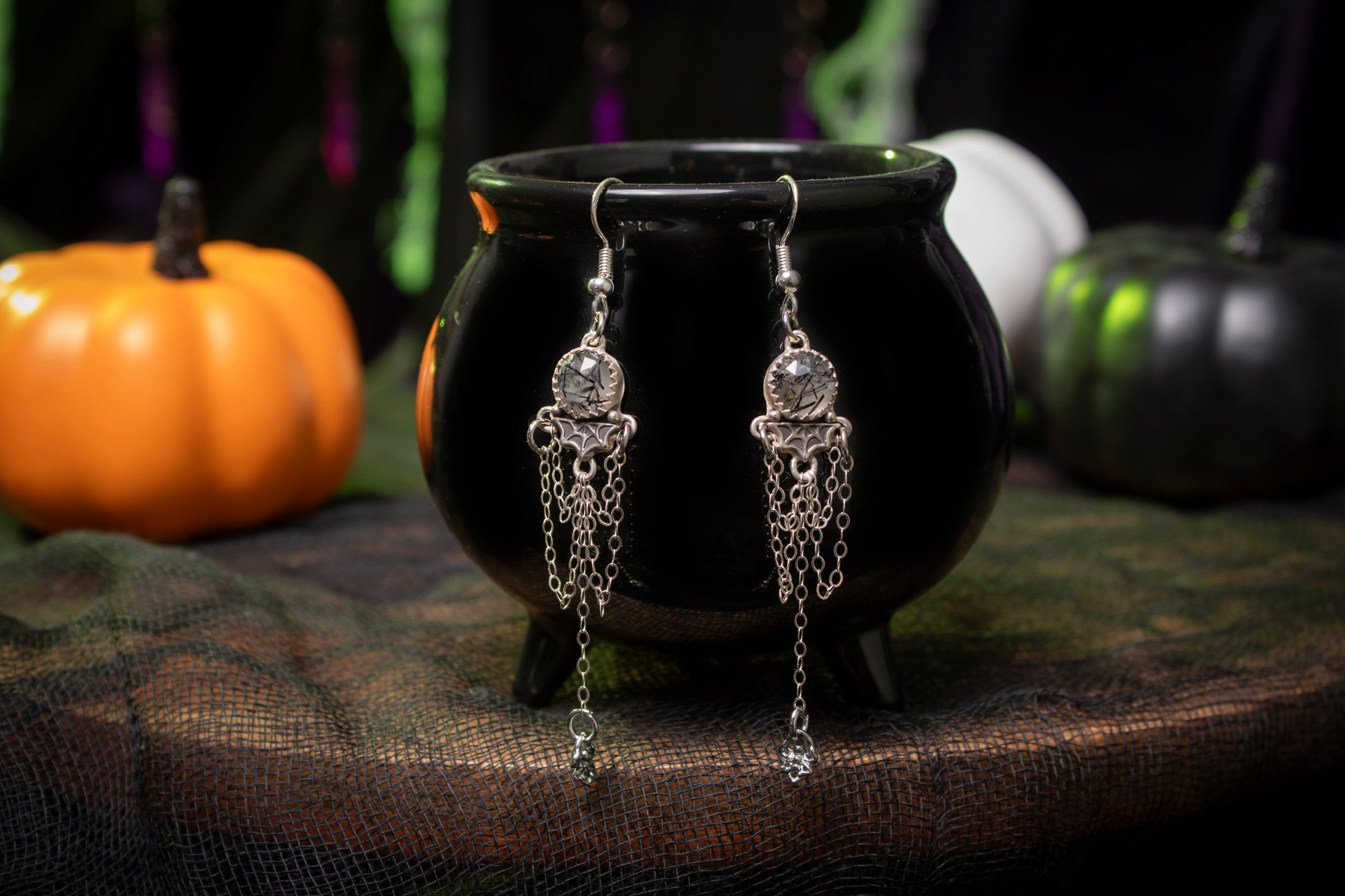 Black Rutilated Quartz & Sterling Silver earrings with spiderweb detail, silver chain webbing and a hanging silver spider